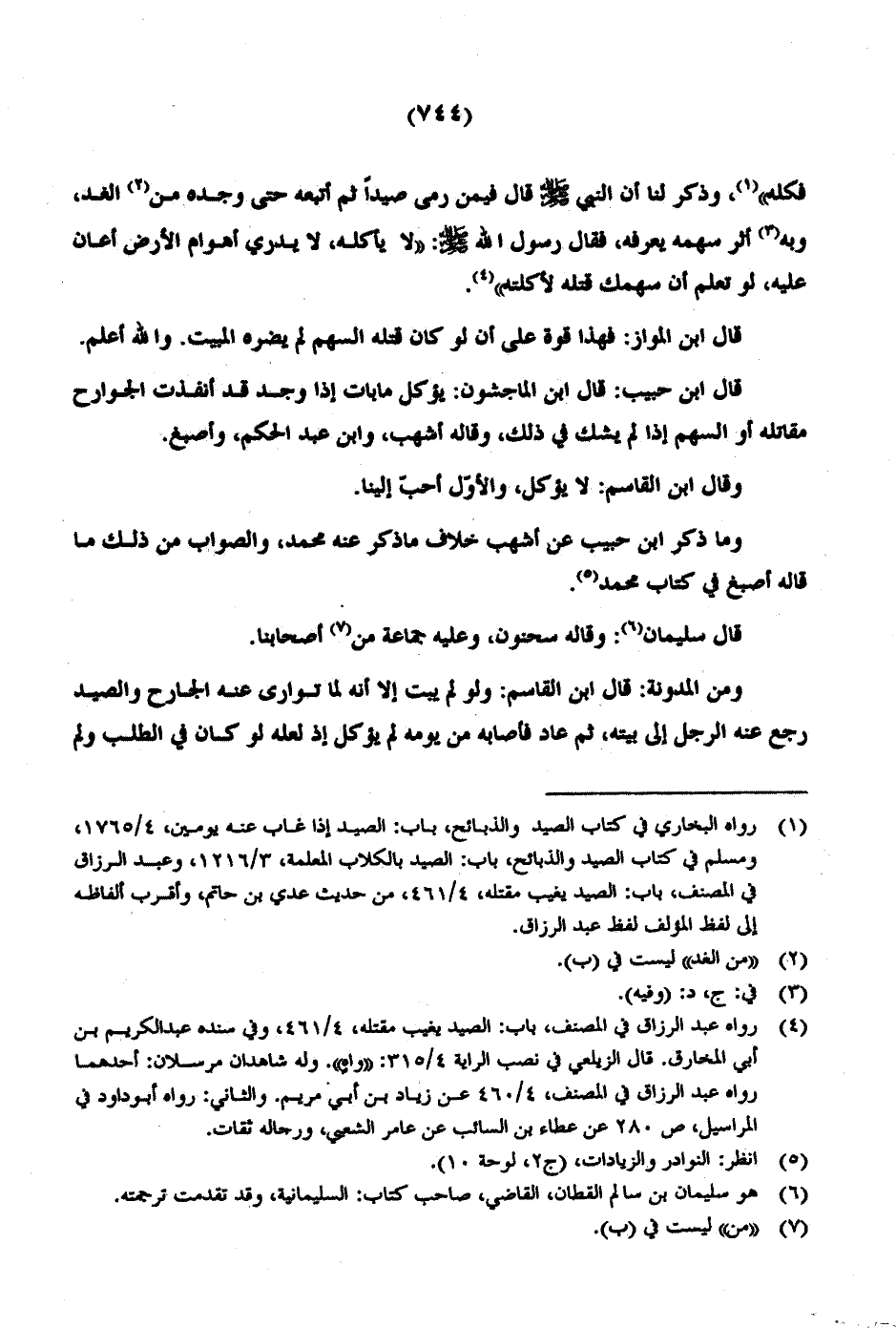 فكله»، وذكر لنا أن النبي صلى الله عليه وسلم قال فيمن رمى صيدًا ثم أتبعه حتى وجده من الغد، وبه أثر سهمه يعرفه، فقال رسول الله صلى الله عليه وسلم: «لا يأكله، لا يدري أهوام الأرض أعان عليه، لو تعلم أن سهمك قتله لأكلته».