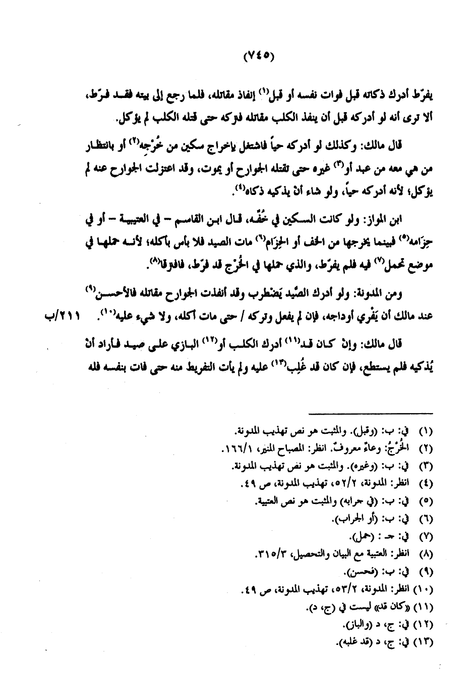 ومن المدونة: ولو أدرك الصَّيد يَضْطرب وقد أنفذت الجوارح مقاتله فالأحسن عند مالك أن يَفْري أوداجه، فإن لم يفعل وتركه / حتى مات أكله، ولا شيء عليه. 211/ ب