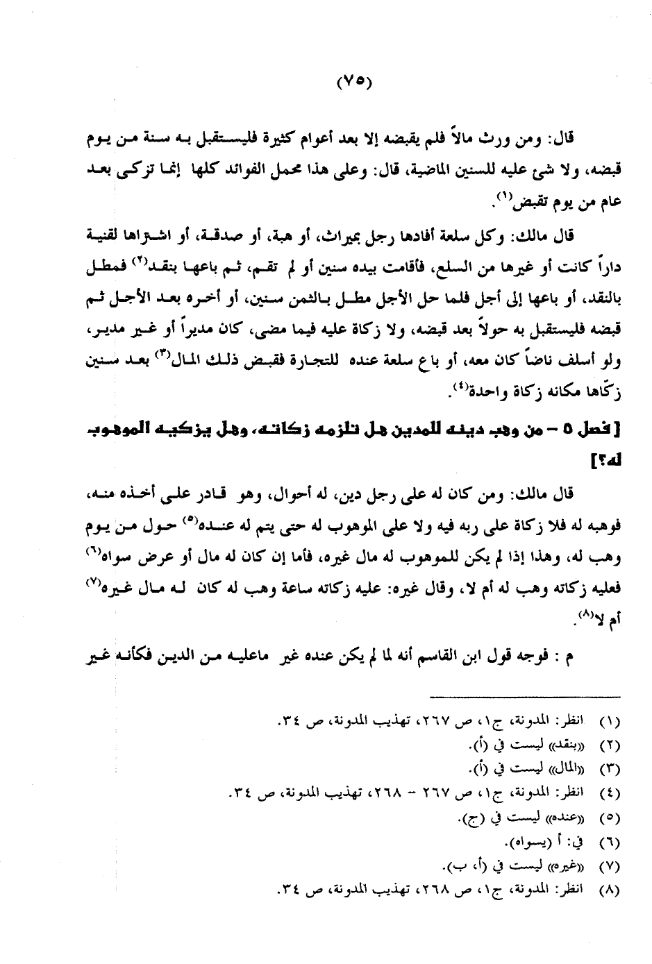 قال: ومن ورث مالاً فلم يقبضه إلا بعد أعوام كثيرة فليستقبل به سنة من يوم قبضه، ولا شيء عليه للسنين الماضية، قال: وعلى هذا محمل الفوائد كلها إنما تزكى بعد عام من يوم تقبض.