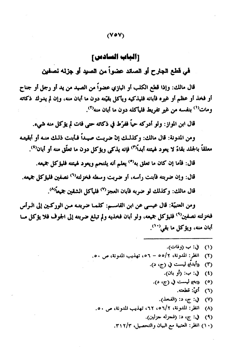 ومن المدونة: قال مالك: وكذلك إن ضربت صيداً فأبنت ذلك منه أو أبقيته معلقاً بالجلد بقاءً لا يعود لهيئته أبداً فإنه يذكى ويؤكل دون ما تعلق منه أو أبان.