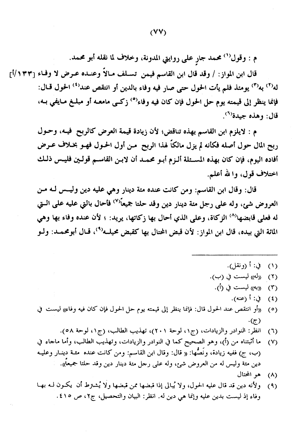 م: لا يلزم ابن القاسم بهذه تناقض؛ لأن زيادة قيمة العرض كالربح فيه، وحول ربح المال حول أصله فكأنه لم يزل مالكًا لهذا الربح من أول الحول فهو بخلاف عرض أفاده اليوم، فإن كان بهذه المسئلة ألزم أبو محمد أن لابن القاسم قولين فليس ذلك اختلاف قول، والله أعلم.