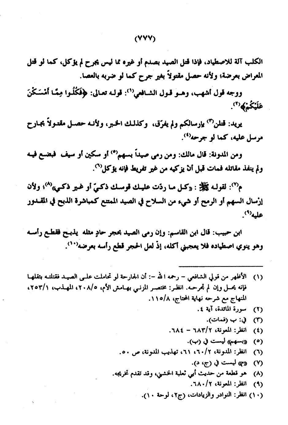 ابن حبيب: قال ابن القاسم: وإن رمى الصيد بحجر حادٍ مثله يذبح فقطع رأسه وهو ينوي اصطياده فلا يعجبني أكله، إذ لعل الحجر قطع رأسه بعرضه.