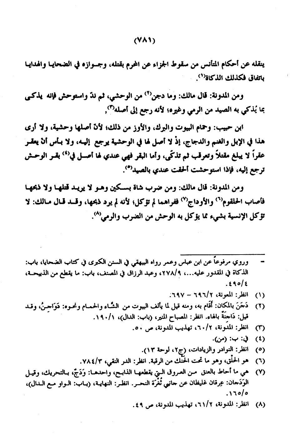 ابن حبيب: وحمام البيوت والبرك، والأوز من ذلك؛ لأن أصلها وحشية، ولا أرى هذا في الإبل والغنم والدجاج، إذ لا أصل لها في الوحشية يرجع إليه، ولا بأس أن يعقر عقراً لا يبلغ مقتلاً وتعرقب ثم تذكى، وأما البقر فهي عندي لها أصل في بقر الوحش ترجع إليه، فإذا استوحشت ألحقت عندي بالصيد.
