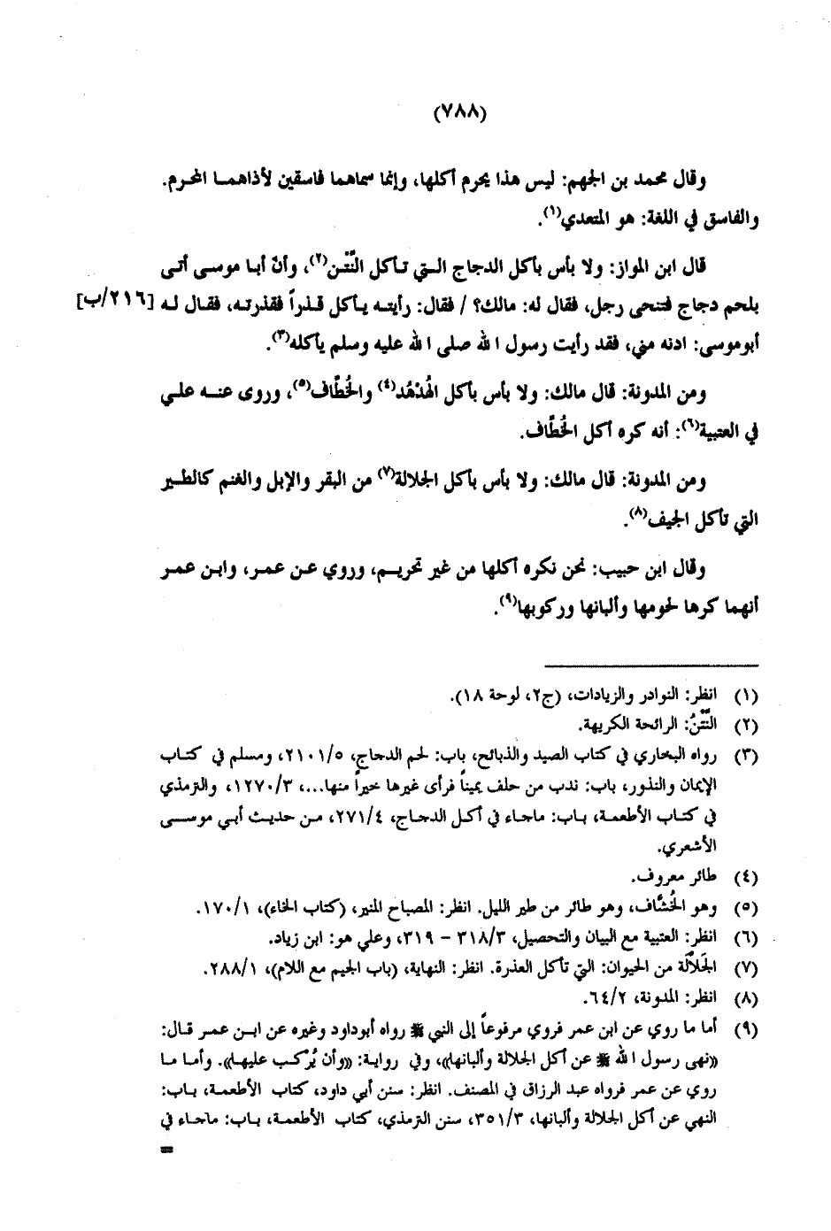 قال ابن المواز: ولا بأس بأكل الدجاج التي تأكل النتن، وأن أبا موسى أتى بلحم دجاج فتنحى رجل، فقال له: مالك؟ / فقال: رأيته يأكل قذراً فقذرته، فقال له أبو موسى: ادنه مني، فقد رأيت رسول الله صلى الله عليه وسلم يأكله.
