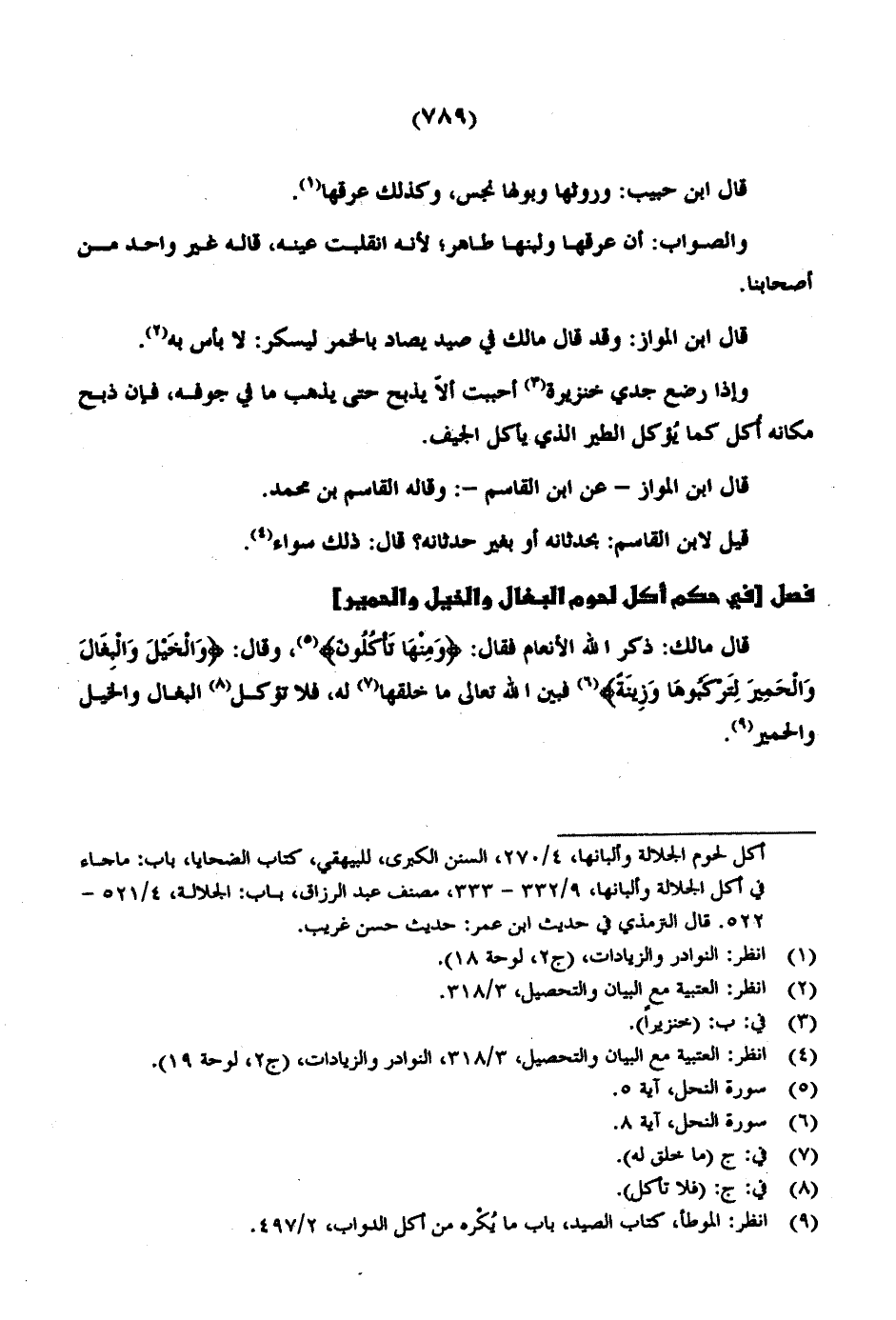 قال مالك: ذكر الله الأنعام فقال: {وَمِنْهَا تَاكُلُونَ}، وقال: {وَالْخَيْلَ وَالْبِغَالَ وَالْحَمِيرَ لِتَرْكَبُوهَا وَزِينَةً} فبين الله تعالى ما خلقها له، فلا تؤكل البغال والخيل والحمير.