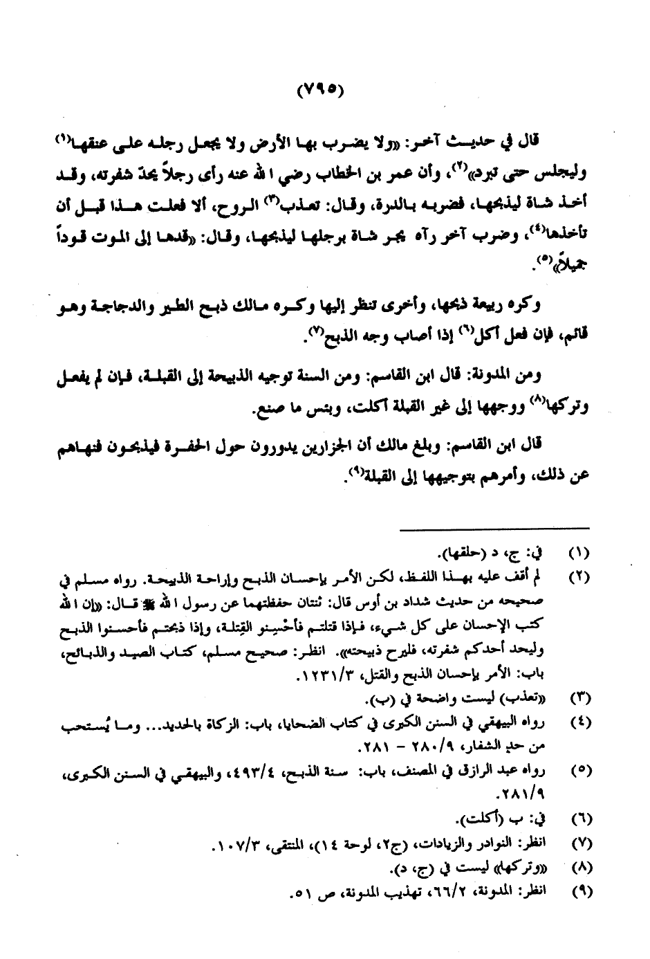 قال في حديث آخر: "ولا يضرب بها الأرض ولا يجعل رجله على عنقها وليجلس حتى تبرد"، وأن عمر بن الخطاب رضي الله عنه رأى رجلاً يحد شفرته، وقد أخذ شاة ليذبحها، فضربه بالدرة، وقال: تعذب الروح، ألا فعلت هذا قبل أن تأخذها، وضرب آخر رآه يجر شاة برجلها ليذبحها، وقال: "قدها إلى الموت قوداً جميلاً".