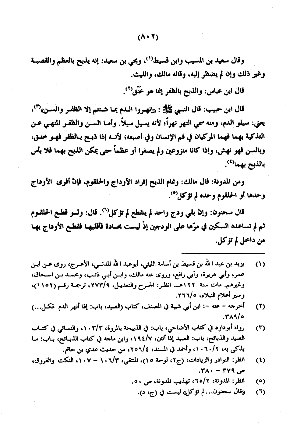قال ابن حبيب: قال النبي صلى الله عليه وسلم: "انهروا الدم بما شئتم إلا الظفر والسن"، يعني: سيلو الدم، ومنه سمي النهر نهراً، لأنه يسيل سيلاً. وأما السن والظفر المنهي عن التذكية بهما فهما المركبان في فم الإنسان وفي أصبعه؛ لأنه إذا ذبح بالظفر فهو خنق، وبالسن فهو نهش، وإذا كانا منزوعين ولم يصغرا أو عظماً حتى يمكن الذبح بهما فلا بأس بالذبح بهما.