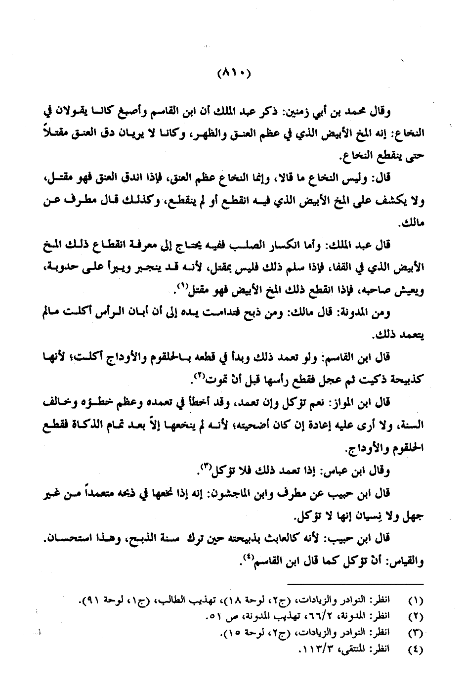 وقال محمد بن أبي زمنين: ذكر عبد الملك أن ابن القاسم وأصبغ كانا يقولان في النخاع: إنه المخ الأبيض الذي في عظم العنق والظهر، وكانا لا يريان دق العنق مقتلاً حتى ينقطع النخاع.