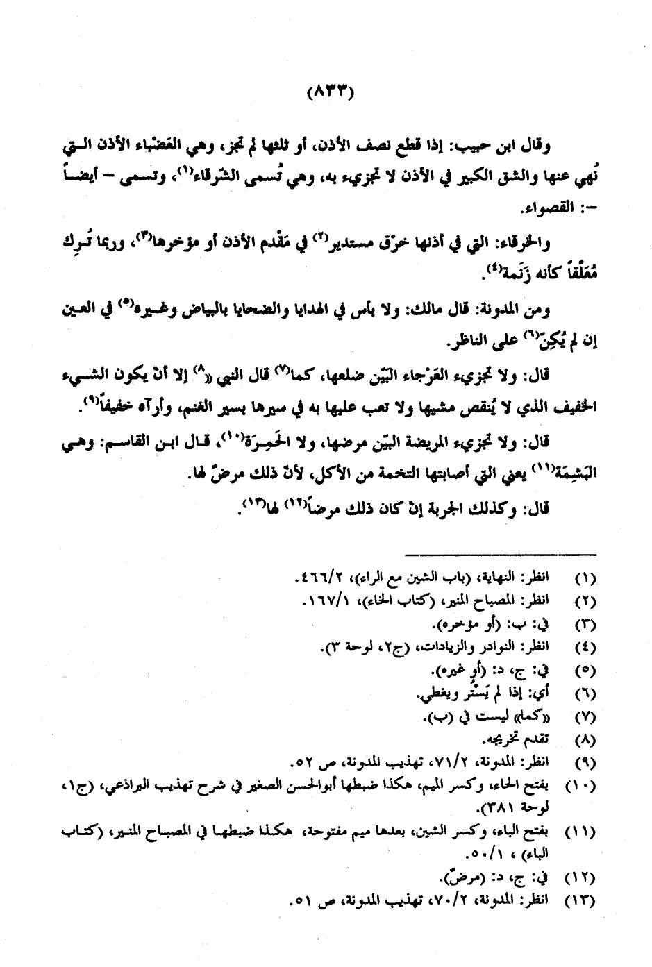 وقال ابن حبيب: إذا قطع نصف الأذن، أو ثلثها لم تجز، وهي العضباء الأذن التي نُهي عنها والشق الكبير في الأذن لا تجزئ به، وهي تسمى الشرقاء، وتسمى- أيضاً-: القصواء.