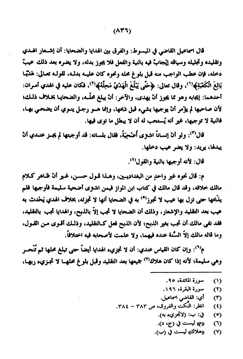 قال إسماعيل القاضي في المبسوط: والفرق بين الهدايا والضحايا: أن إشعار الهدي وتقليده وتجليله وسياقه إيجاب فيه بالنية والفعل فلا يجوز بدله، ولا يضره بعد ذلك عيب دخله، فإن عطب الواجب منه قبل بلوغ محله ونحوه كان عليه بدله، لقوله تعالى: {هَدْيًا بَالِغَ الْكَعْبَةِ}، وقال تعالى: {حَتَّى يَبْلُغَ الْهَدْيُ مَحِلَّهُ}، فكان عليه في الهدي أمران: أحدهما: إيجابه وهو مما يجوز أن يهدى، والآخر: أن يبلغ محله، والضحايا بخلاف ذلك؛ لأن صاحبها لم يؤمر أن يوجبها بشيء قبل ذبحها، وإنما هو رجل ينوي أن يضحي بها، فالنية لا توجبها، غير أنه يستحب له أن لا يبطل ما نوى فيها.