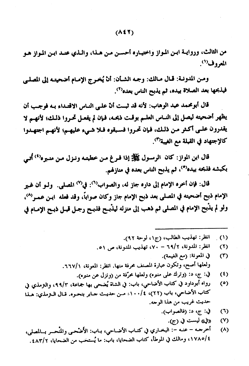 قال ابن المواز: كان الرسول صلى الله عليه وسلم إذا فرغ من خطبته ونزل من منبره أتي بكبشه فذبحه بيده، ثم يذبح الناس بعده في منازلهم.