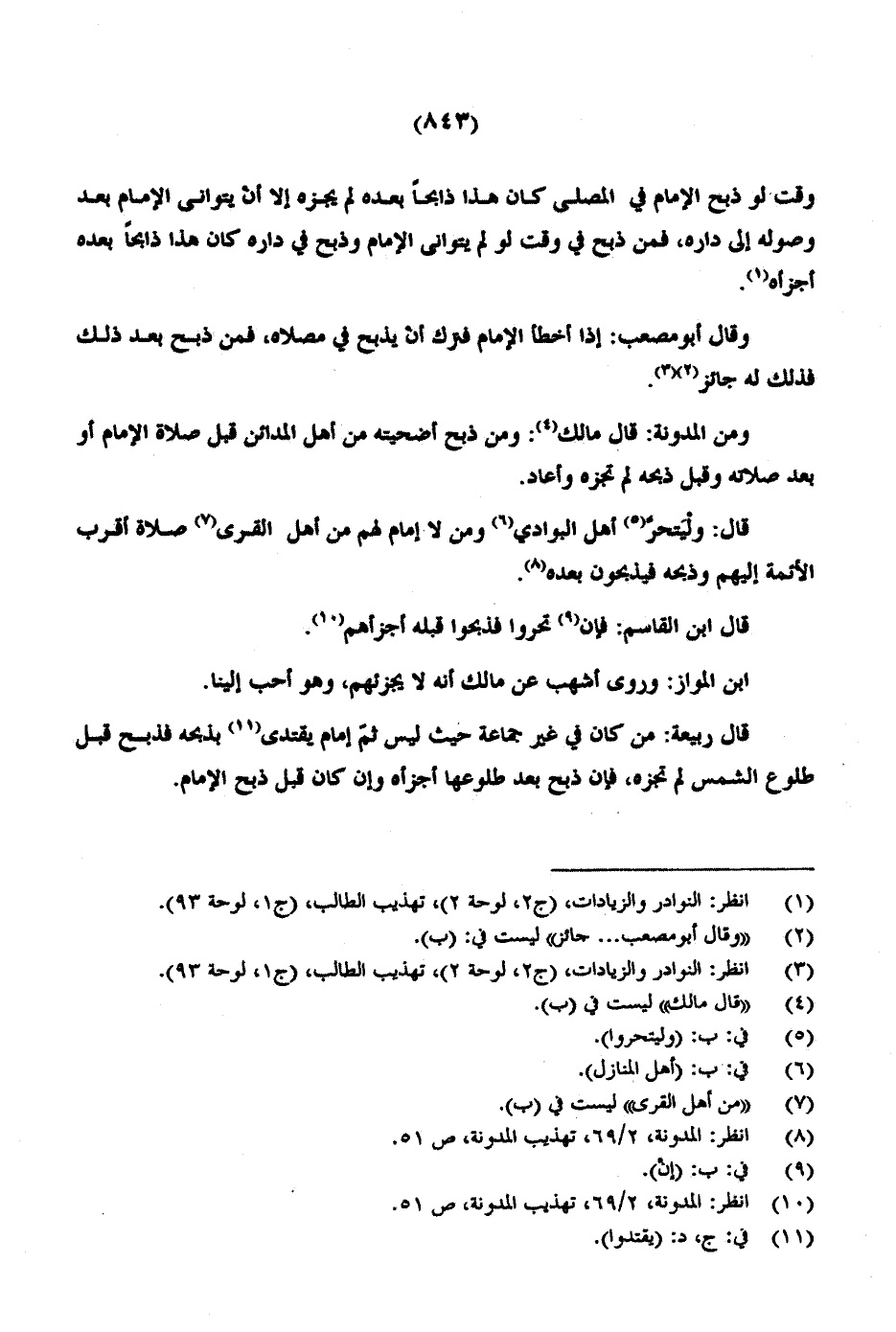 ومن المدونة: قال مالك: ومن ذبح أضحيته من أهل المدائن قبل صلاة الإمام أو بعد صلاته وقبل ذبحه لم تجزه وأعاد.