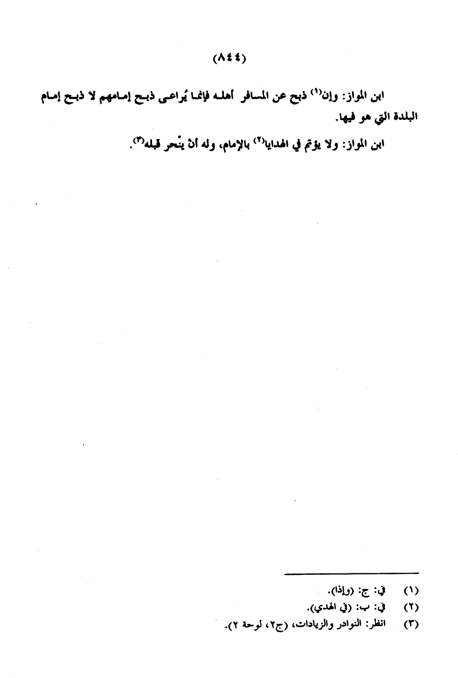 ابن المواز: وإن ذبح عن المسافر أهله فإنما يراعى ذبح إمامهم لا ذبح إمام البلدة التي هو فيها.