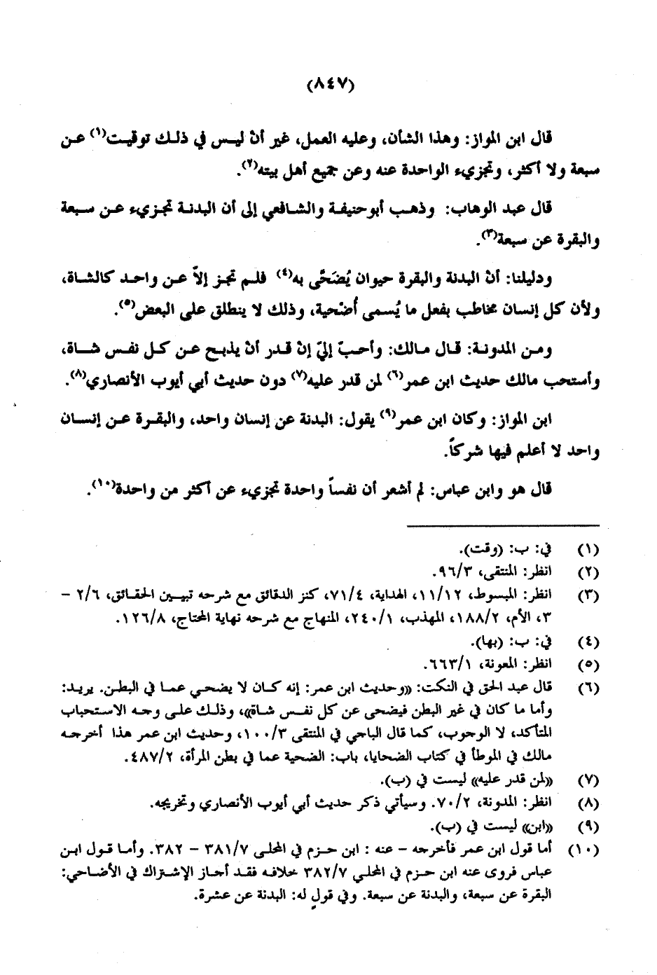 قال عبد الوهاب: وذهب أبو حنيفة والشافعي إلى أن البدنة تجزئ عن سبعة والبقرة عن سبعة.