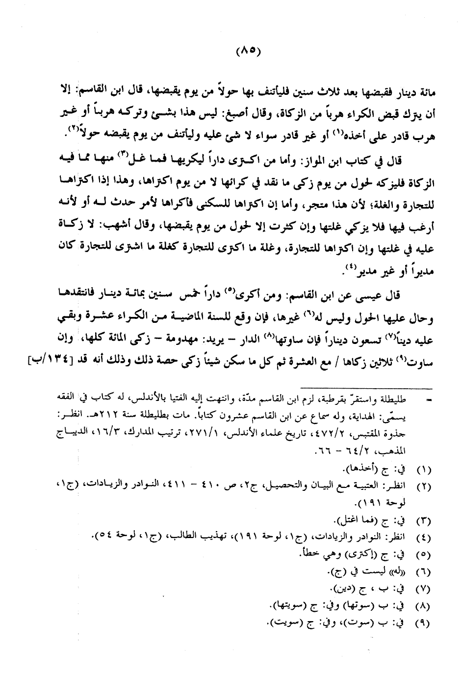مائة دينار فقبضها بعد ثلاث سنين فليأتنف بها حولاً من يوم يقبضها، قال ابن القاسم: إلا أن يترك قبض الكراء هرباً من الزكاة، وقال أصبغ: ليس هذا بشيء وتركه هرباً أو غير هرب قادر على أخذه أو غير قادر سواء لا شيء عليه وليأتنف من يوم يقبضه حولاً.