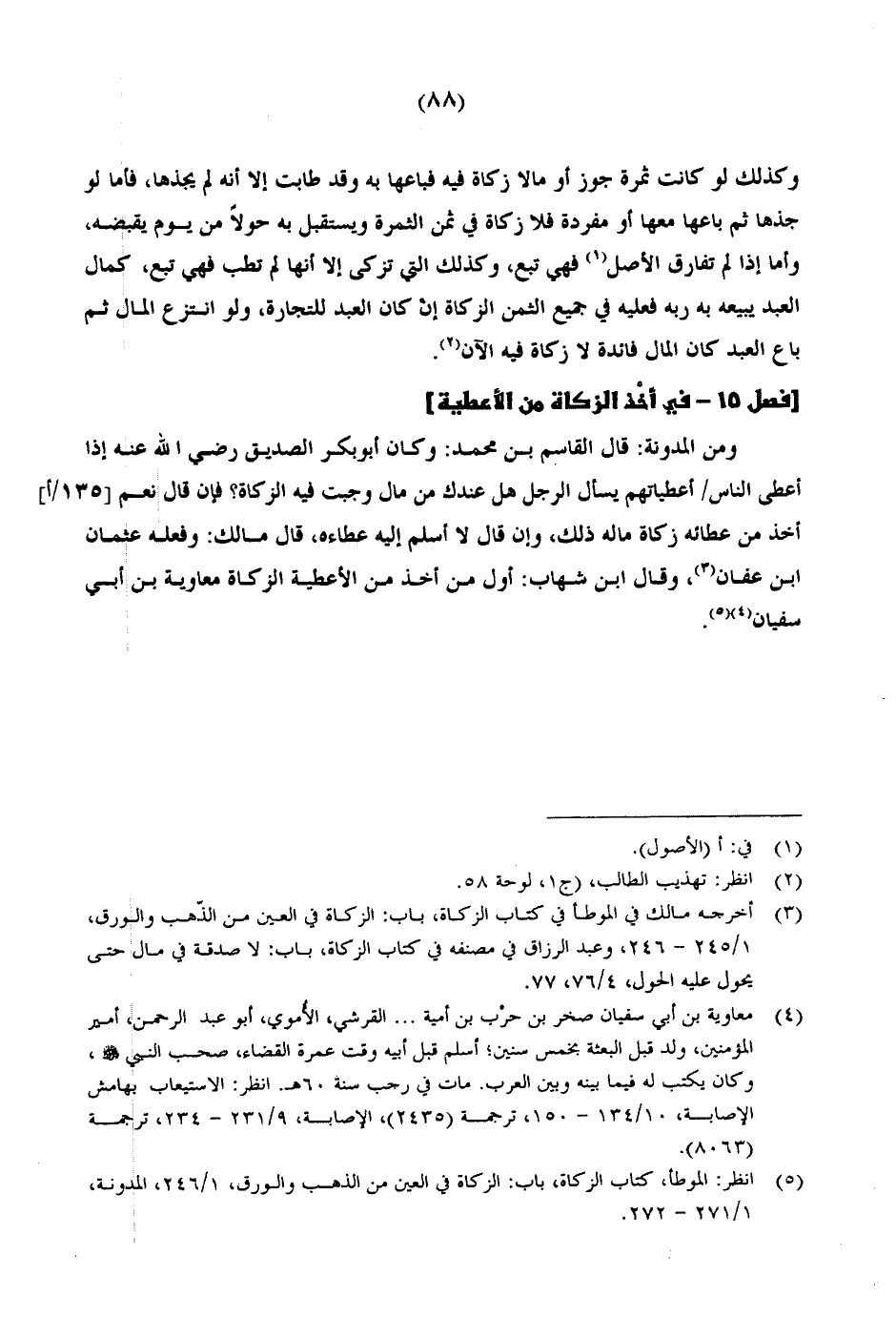 ومن المدونة: قال القاسم بن محمد: وكان أبو بكر الصديق رضي الله عنه إذا أعطى الناس/ أعطياتهم يسأل الرجل هل عندك من مال وجبت فيه الزكاة؟ فأن قال نعم [135/ أ] أخذ من عطائه زكاة ماله ذلك، وإن قال لا أسلم إليه عطاءه، قال مالك: وفعله عثمان ابن عفان، وقال ابن شهاب: أول من أخذ من الأعطية الزكاة معاوية بن أبي سفيان.