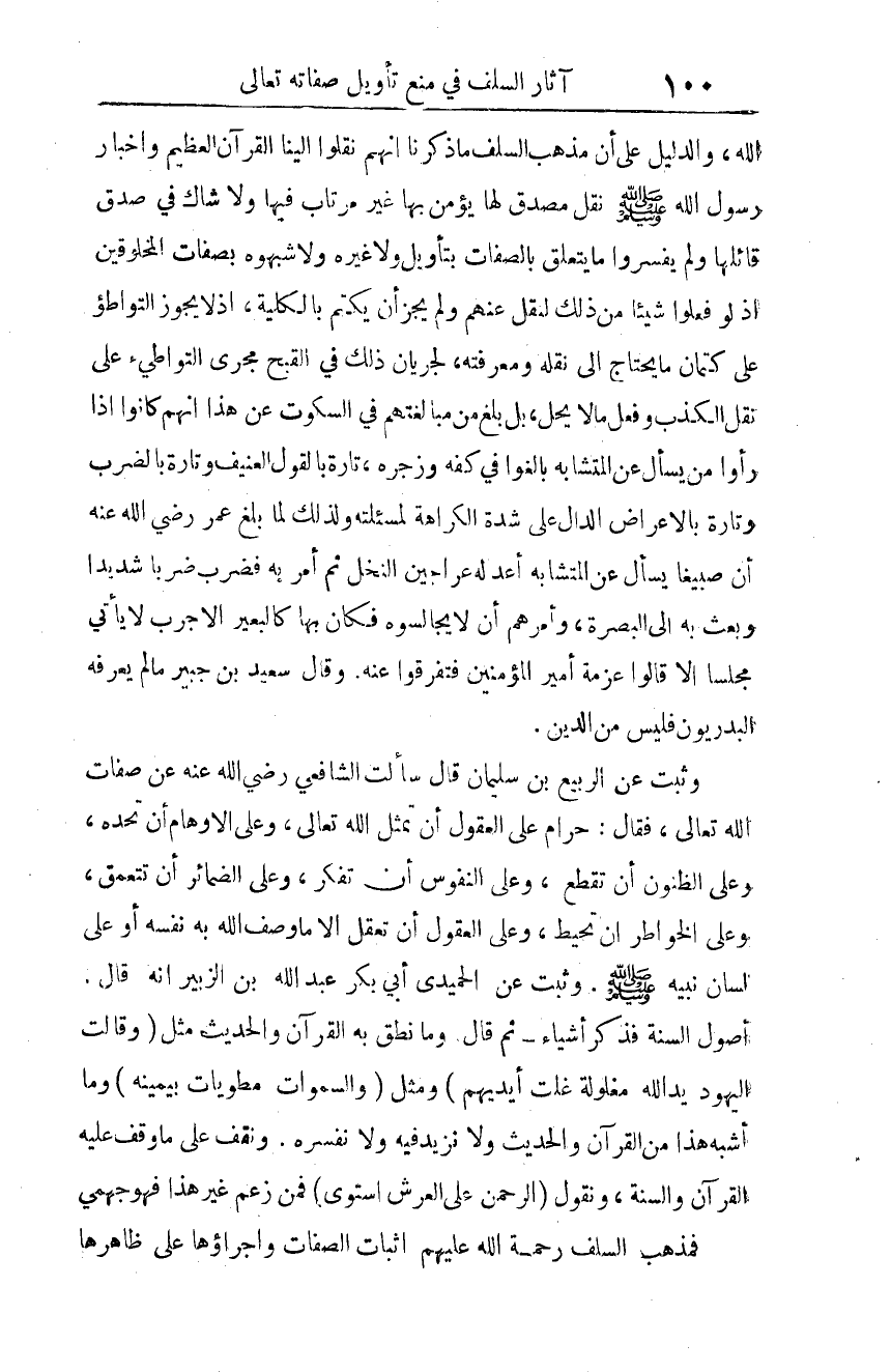 الله، والدليل على أن مذهب السلف ما ذكرنا أنهم نقلوا إلينا القرآن العظيم، وإخبار رسول الله صلى الله عليه وسلم نقل مصدق لها، يؤمن بها غير مرتاب فيها ولا شاك في صدق قائلها، ولم يفسروا ما يتعلق بالصفات بتأويل ولا غيره، ولا شبهوه بصفات المخلوقين؛ إذ لو فعلوا شيئا من ذلك لنقل عنهم، ولم يجز أن يكتم بالكلية، إذ لا يجوز التواطؤ على كتمان ما يحتاج إلى نقله ومعرفته؛ لجريان ذلك في القبح مجرى التواطؤ على نقل الكذب، وفعل ما لا يحل، بل بلغ من مبالغتهم في السكوت عن هذا، أنهم كانوا إذا رأوا من يسأل عن المتشابه بالغوا في كفه وزجره، تارة بالقول العنيف، وتارة بالضرب، وتارة بالإعراض الدال على شدة الكراهة لمسألته.