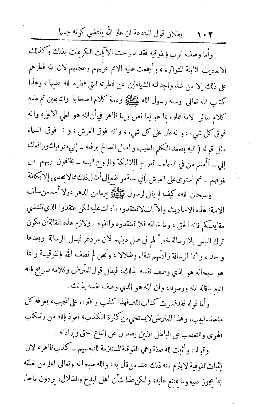ولازم هذه المقالة أن يكون ترك الناس بلا رسالة خيرا لهم في أصل دينهم؛ لأن مردَّهم قبل الرسالة وبعدها واحد، وإنما الرسالة زادتهم شقاء وضلالا. ونحن لم نصف الله بالفَوقية، وإنما هو -سبحانه- هو الذي وصف نفسه بذلك، فبطل قول المعترض، وكلامه صريح بأنه اتبع ما قاله الله ورسوله، وأن الله هو الذي وصف نفسه بذلك.
