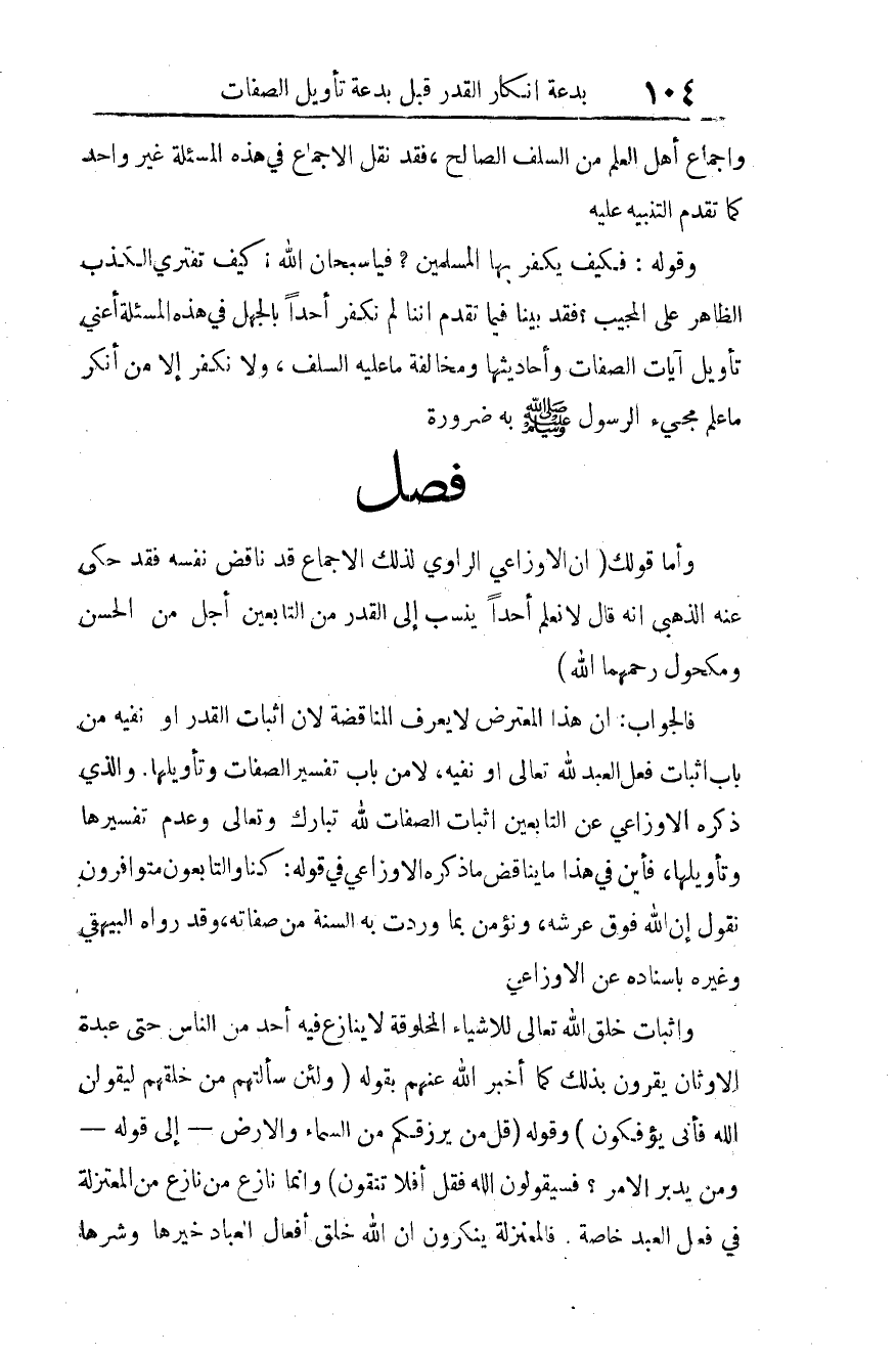 فالجواب: أن هذا المعترض لا يعرف المناقضة؛ لأن إثبات القدر أو نفيه من باب إثبات فعل العبد لله -تعالى- أو نفيه، لا من باب تفسير الصفات وتأويلها، والذي ذكره الأَوْزَاعِيُّ عن التابعين إثبات الصفات لله -تبارك وتعالى- وعدم تفسيرها وتأويلها، فأين في هذا ما يناقض ما ذكره الأوزاعي في قوله: "كنا والتابعون متوافرون نقول: إن الله فوق عرشه. ونؤمن بما وردت به السنة من صفاته"؟ وقد رواه البَيْهَقِيُّ وغيره، بإسناده عن الأَوْزَاعِيِّ.