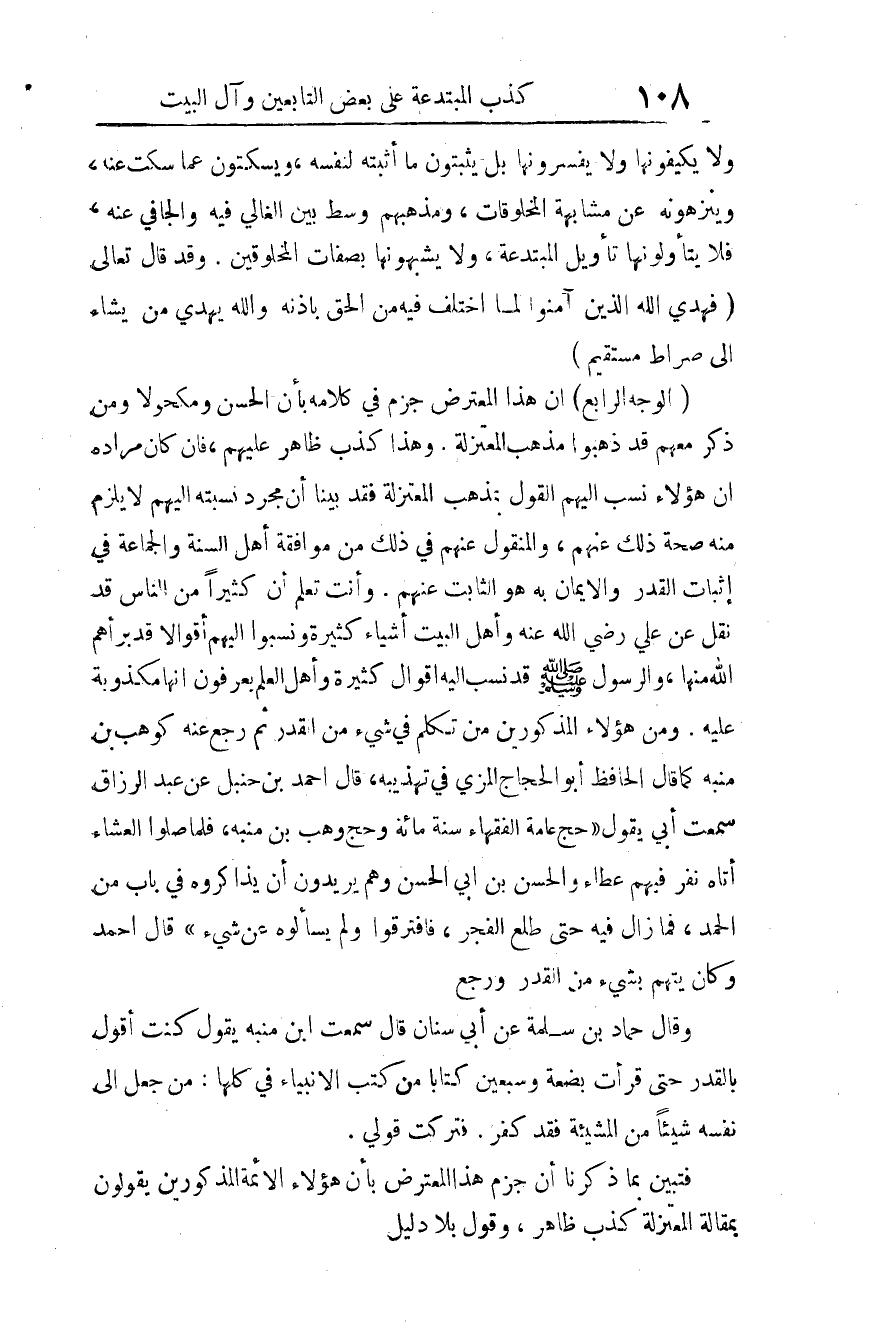 (الوجه الرابع) أن هذا المعترض جزم في كلامه بأن الحَسَن ومَكْحُولا ومن ذكر معهم قد ذهبوا مذهب المُعْتَزَلَة، وهذا كذب ظاهر عليهم، فإن كان مراده أن هؤلاء نسب إليهم القول بمذهب المُعْتَزَلَة، فقد بيَّنَّا أن مجرد نسبته إليهم لا يلزم منه صحة ذلك عنهم، والمنقول عنهم في ذلك -من موافقة أهل السنة والجماعة في إثبات القدر والإيمان به- هو الثابت عنهم.