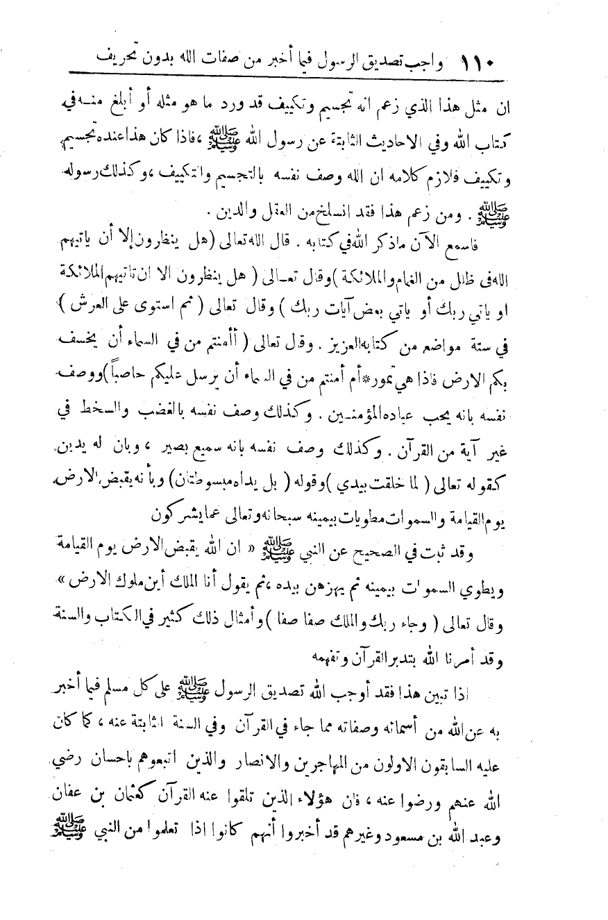 إذا تبين هذا، فقد أوجب الله تصديق الرسول صلى الله عليه وسلم على كل مسلم فيما أخبر به عن الله من أسمائه وصفاته، مما جاء في القرآن وفي السنة الثابتة عنه، كما كان عليه السابقون الأولون من المهاجرين، والأنصار والذين اتبعوهم بإحسان، رضي الله عنهم ورضوا عنه.