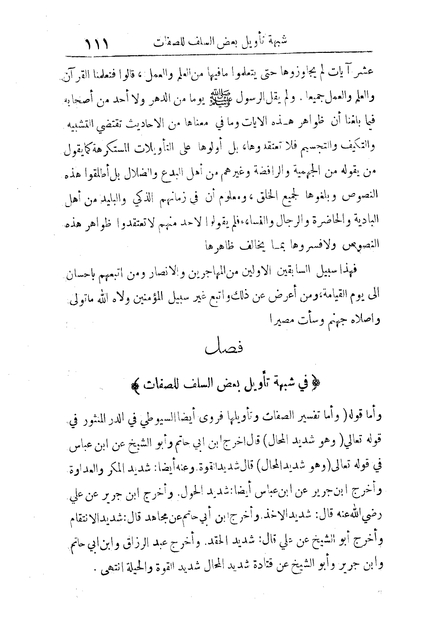 وأما قوله: (وأما تفسير الصفات وتأويلها فروى -أيضا- السُّيوطِي في "الدر المنثور" في قوله تعالى: {وَهُوَ شَدِيدُ الْمِحَالِ} 1 قال: أخرج ابن أبي حاتم وأبو الشيخ عن ابن عَبَّاس في قوله تعالى: {وَهُوَ شَدِيدُ الْمِحَالِ} 2 قال: شديد القوة. وعنه أيضا: شديد المكر والعداوة. وأخرج ابن جرير عن ابن عباس أيضا: شديد الحول.