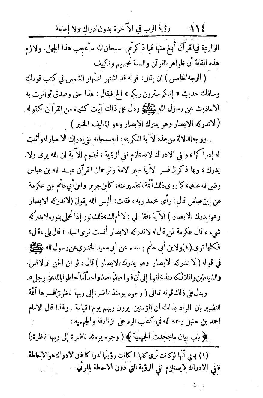 ويدل على ذلك قوله تعالى: {وُجُوهٌ يَوْمَئِذٍ نَاضِرَةٌ إِلَى رَبِّهَا نَاظِرَةٌ} 6 فسرها أئمة التفسير بأن المراد بذلك أن المؤمنين يرون ربهم يوم القيامة؛ ولهذا قال الإمام أحمد بن حَنبَل -رحمه الله- في كتاب "الرد على الزَّنَادِقَة والجَهْمِيَّة": (باب بيان ما جحدت الجَهْمِيَّة) {وُجُوهٌ يَوْمَئِذٍ نَاضِرَةٌ إِلَى رَبِّهَا نَاظِرَةٌ} 7.