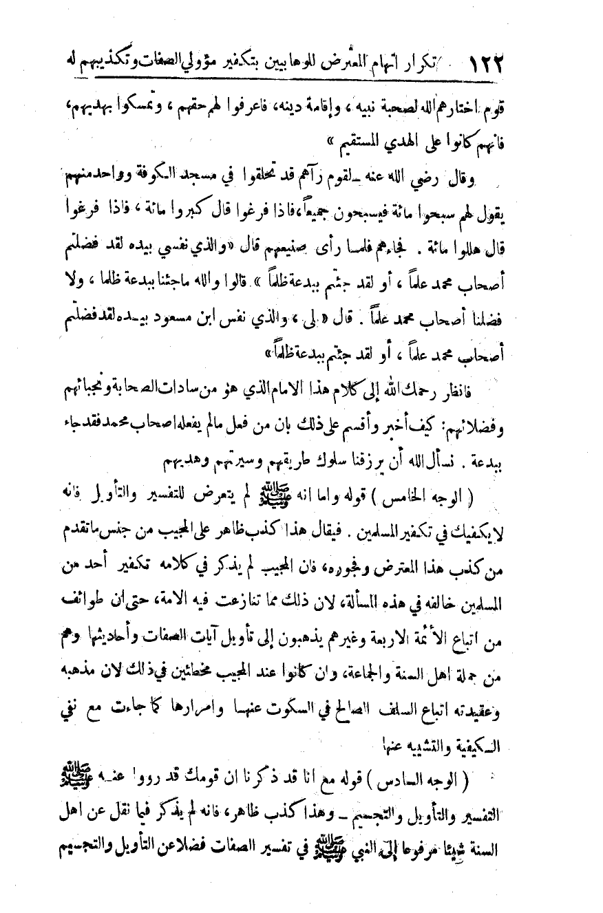 (الوجه الخامس): قوله: "وأما أنه صلى الله عليه وسلم لم يتعرض للتفسير والتأويل، فإنه لا يكفيك في تكفير المسلمين". فيقال: هذا كذب ظاهر على المجيب، من جنس ما تقدم من كذب هذا المعترض وفجوره، فإن المجيب لم يذكر في كلامه تكفير أحد من المسلمين خالفه في هذه المسألة؛ لأن ذلك مما تنازعت فيه الأمة، حتى إن طوائف من أتباع الأئمة الأربعة وغيرهم يذهبون إلى تأويل آيات الصفات وأحاديثها، وهم من جملة أهل السنة والجماعة، وإن كانوا عند المجيب مخطئين في ذلك؛ لأن مذهبه وعقيدته اتِّباع السلف الصالح في السكوت عنها، وإمرارها كما جاءت، مع نفي الكيفية والتشبيه عنها.