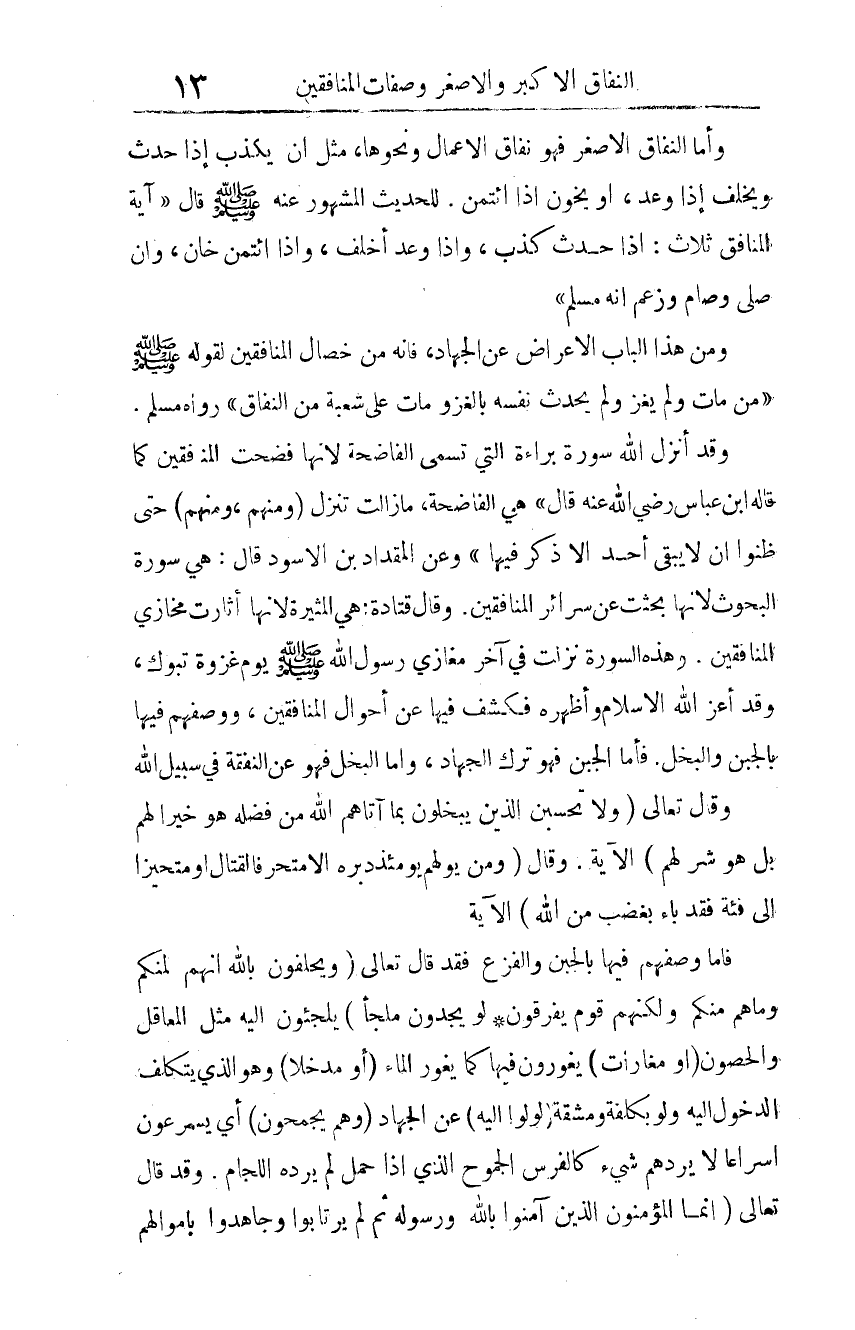 ومن هذا الباب: الإعراض عن الجهاد، فإنه من خصال المنافقين لقوله صلى الله عليه وسلم: "من مات ولم يَغْزُ، ولم يحدث نفسه بالغزو مات على شعبة من النفاق"2 رواه مسلم.