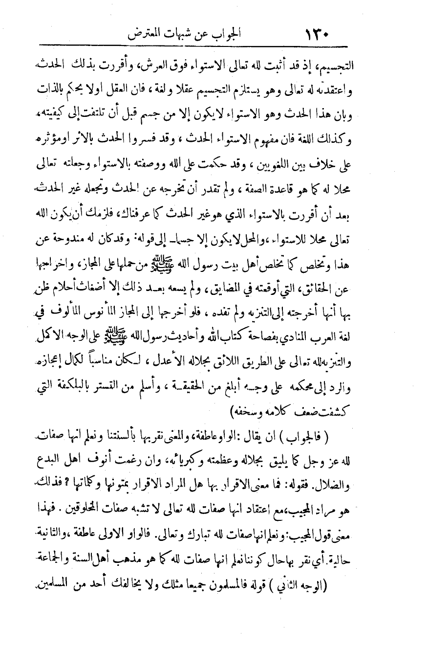 وكذلك اللغة، فإن مفهوم الاستواء الحدث، وقد فسروا الحدث بالأثر أو مؤثره على خلاف بين اللغويين، وقد حكمت على الله ووصفته بالاستواء، وجعلته -تعالى- محلا له كما هو قاعدة الصفة، ولم تقدر أن تخرجه عن الحدث وتجعله غير الحدث بعد أن أقررت بالاستواء الذي هو غير الحدث كما عرفناك، فلزمك أن يكون الله -تعالى- محلا للاستواء، والمحل لا يكون إلا جسما.