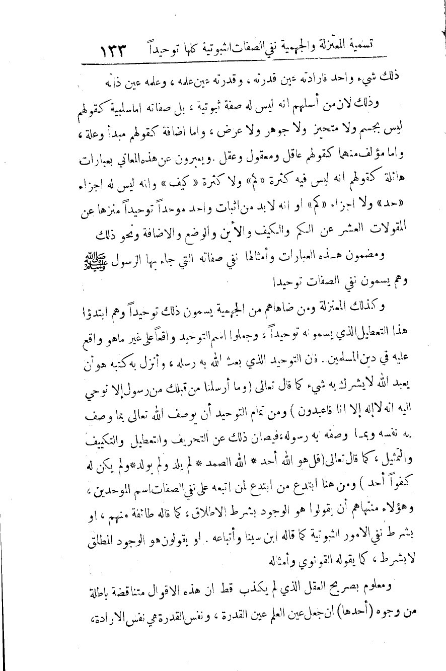 ومضمون هذه العبارات وأمثالها نفي صفاته التي جاء بها الرسول صلى الله عليه وسلم، وهم يسمون نفي الصفات توحيدا، وكذلك المُعْتَزَلَة ومن ضاهاهم من الجَهْمِيَّة يسمون ذلك توحيدا، وهم ابتدؤوا هذا التعطيل الذي يسمونه توحيدا، وجعلوا اسم التوحيد واقعا على غير ما هو واقع عليه في دين المسلمين.