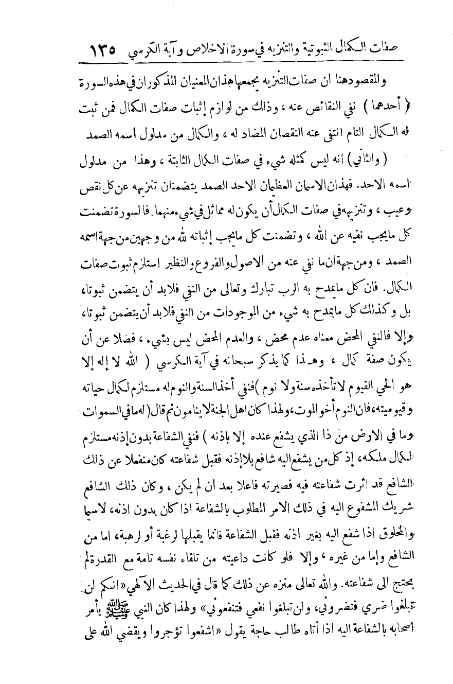 فالسورة تضمنت كل ما يجب نفيه عن الله، وتضمنت كل ما يجب إثباته لله من وجهين؛ من جهة اسمه "الصَّمد"، ومن جهة أن ما نُفي عنه من الأصول والفروع والنظير استلزم ثبوت صفات الكمال؛ فإن كل ما يمدح به الرب -تبارك وتعالى- من النفي فلا بد أن يتضمن ثبوتا، بل وكذلك كل ما يُمدح به شيء من الموجودات من النفي فلا بد أن يتضمن ثبوتا، وإلا فالنفي المحض معناه عدم محض، والعدم المحض ليس بشيء، فضلا عن أن يكون صفة كمال.