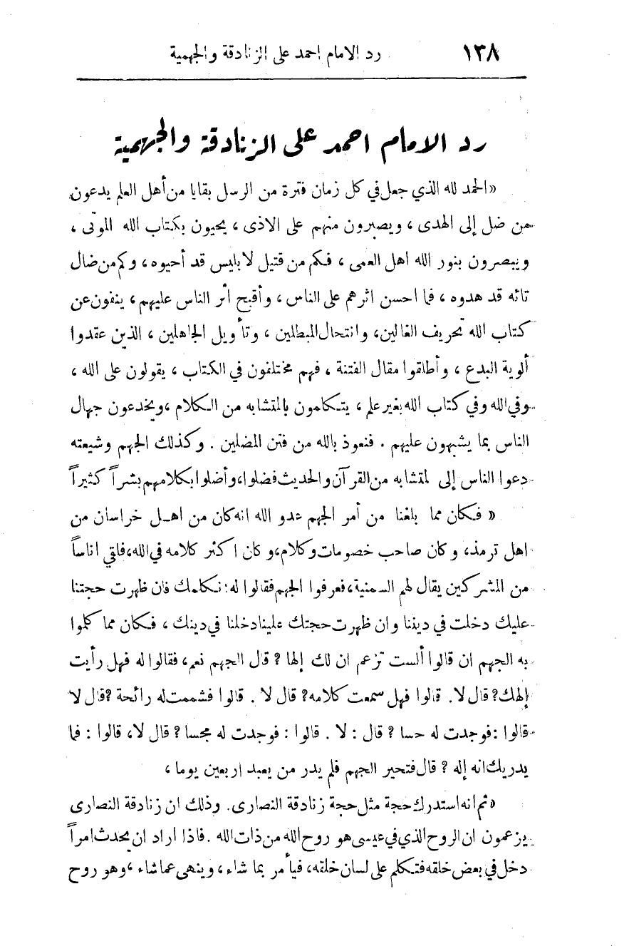 "الحمد لله الذي جعل في كل زمان فترة من الرسل بقايا من أهل العلم يدعون من ضل إلى الهدى، ويصبرون منهم على الأذى، يحيون بكتاب الله الموتى، ويبصرون بنور الله أهل العمى، فكم من قتيل لإبليس قد أحيوه، وكم من ضال تائه قد هدوه، فما أحسن أثرهم على الناس، وأقبح أثر الناس عليهم، ينفون عن كتاب الله تحريف الغالين، وانتحال المبطلين، وتأويل الجاهلين، الذين عقدوا ألوية البدع، وأطلقوا مقال الفتنة، فهم مختلفون في الكتاب، يقولون على الله، وفي الله، وفي كتاب الله بغير علم، يتكلمون بالمتشابه من الكلام، ويخدعون جهال الناس بما يشبهون عليهم، فنعوذ بالله من فتن المضلين، وكذلك الجهم وشيعته دعوا الناس إلى المتشابه من القرآن والحديث، فَضَلُّوا وأَضَلُّوا بكلامهم بشرا كثيرا.