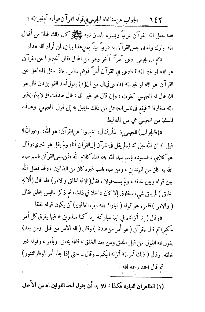 (فالجواب) للجهمي إذا سأل فقال: أخبرونا عن القرآن: هو الله، أو غير الله؟ قيل له: إن الله -جل ثناؤه- لم يقل: في القرآن إن القرآن أنا، ولم يقل: هو غيري، وقال: هو كلامي، فسميناه باسم سمَّاه الله به، فقلنا: كلام الله، فمن سمَّى القرآن باسم سمَّاه الله به كان من المهتدين، ومن سمَّاه باسم غيره كان من الضالين.