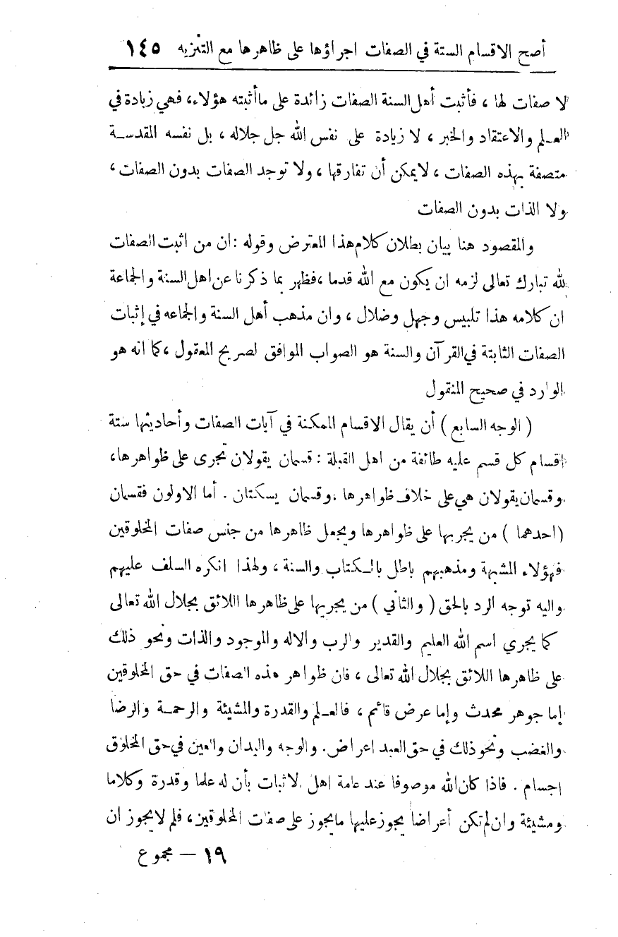 (والثاني): من يجريها على ظاهرها اللائق بجلال الله -تعالى-، كما يجري اسم الله العليم والقدير والرب والإله والموجود والذات ونحو ذلك على ظاهرها اللائق بجلال الله -تعالى-، فإن ظواهر هذه الصفات في حق المخلوقين؛ إما جوهر محدث، وإما عرض قائم، فالعلم والقدرة والمشيئة والرحمة والرضى والغضب ونحو ذلك في حق العبد أعراض. والوجه واليدان والعين في حق المخلوق أجسام.