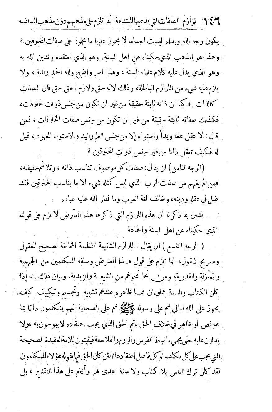 (الوجه التاسع) أن يقال: اللوازم الشنيعة الفظيعة المخالفة لصحيح المعقول وصريح المنقول، إنما تلزم على قول هذا المعترض وسلفه المتكلمين من الجَهْمِيَّة والمُعْتَزَلَة والقَدَرِيَّة، ومن نحا نحوهم من الشِّيعَة والزَّيْدِيَّة.