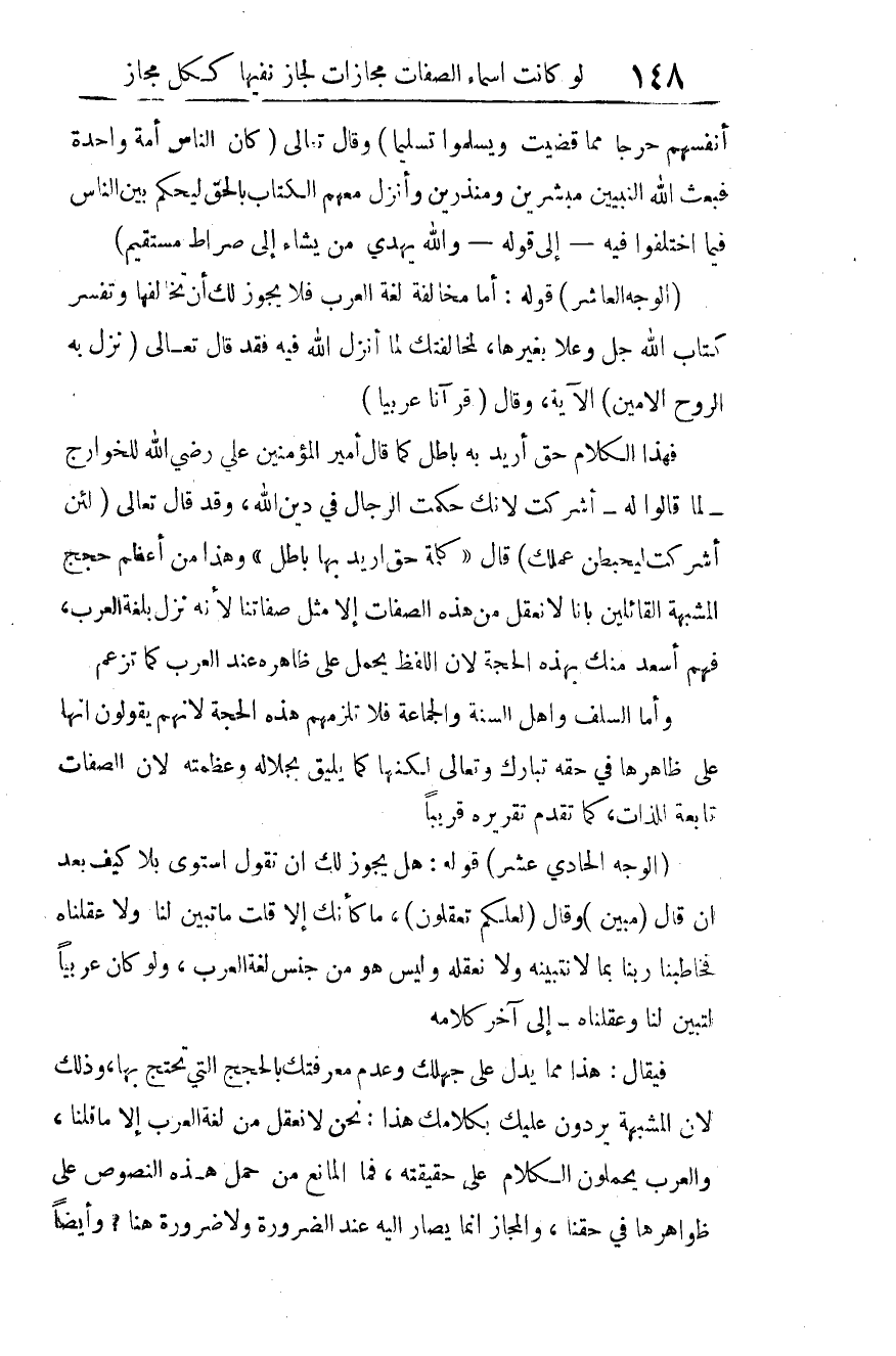 (الوجه الحادي عشر) قوله: "هل يجوز لك أن تقول: استوى بلا كيف بعد أن قال: {مُبِينٌ} وقال: {لَعَلَّكُمْ تَعْقِلُونَ} 6؟ ما كأنك إلا قلت: ما تبين لنا ولا عقلناه، فخاطبنا ربنا بما لا نتبينه ولا نعقله، وليس هو من جنس لغة العرب، ولو كان عربيا لتبين لنا وعقلناه ... " إلى آخر كلامه.