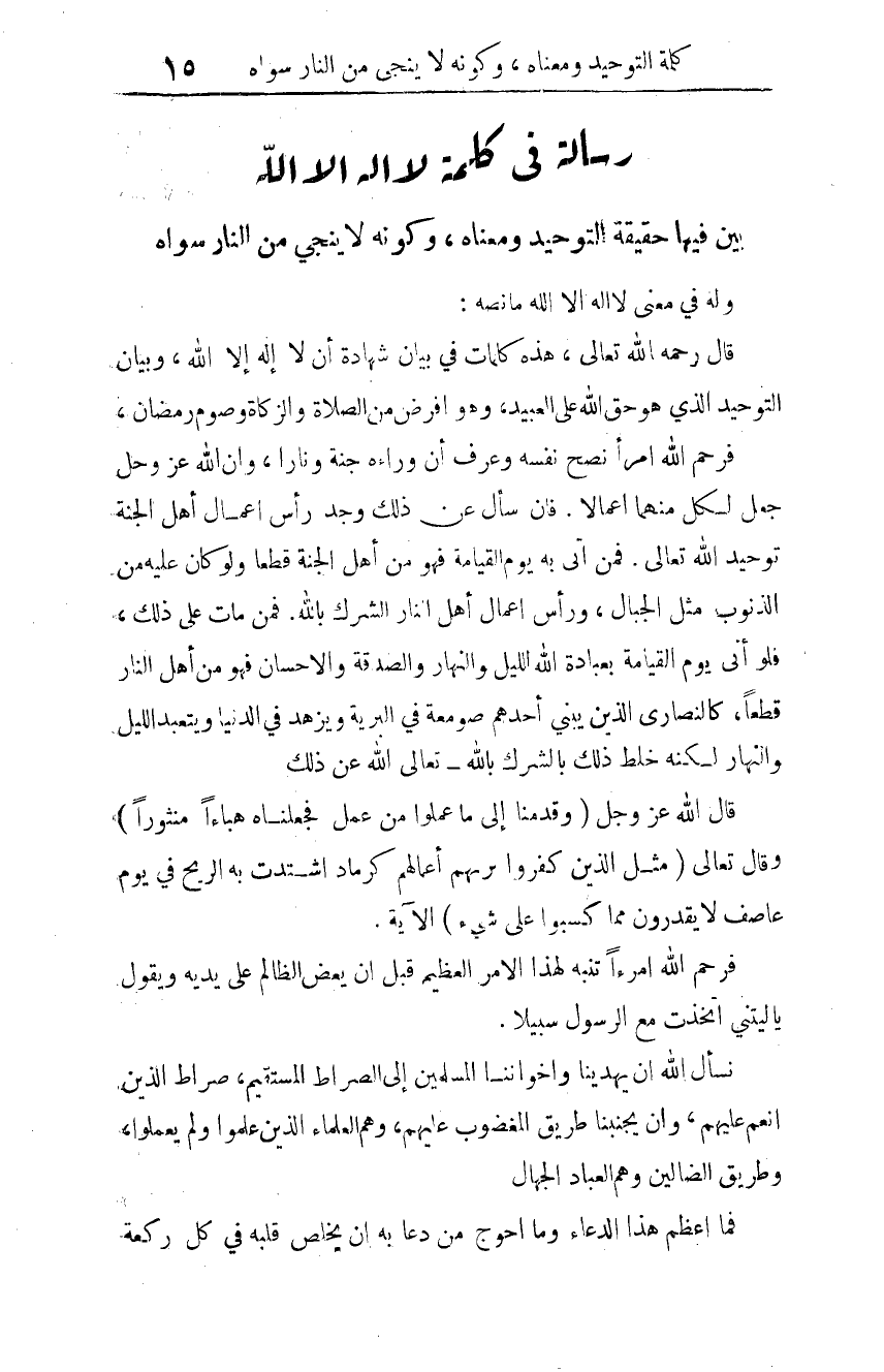 قال -رحمه الله تعالى-: هذه كلمات في بيان شهادة أن لا إله إلا الله، وبيان التوحيد الذي هو: حق الله على العبيد، وهو أفرض من الصلاة والزكاة وصوم رمضان، فرحم الله امرأ نصح نفسه وعرف أن وراءه جنة ونارا، وأن الله عز وجل جعل لكل منهما أعمالا. فإن سأل عن ذلك وجد رأس أعمال أهل الجنة: توحيد الله تعالى.