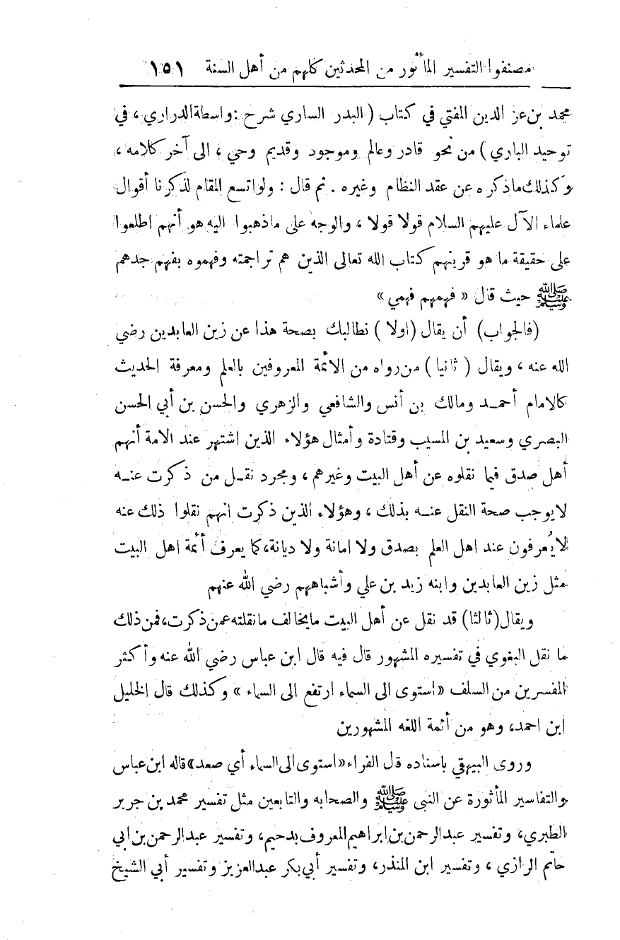 محمد بن عز الدين المفتي في كتاب "البدر الساري شرح: واسطة الدراري، في توحيد الباري" من نحو قادر وعالم وموجود وقديم وحي ... إلى آخر كلامه، وكذلك ما ذكره عن "عقد النظام" وغيره. ثم قال: "ولو اتسع المقام، لذكرنا أقوال علماء الآل -عليهم السلام- قولا قولا، والوجه على ما ذهبوا إليه، هو أنهم اطلعوا على حقيقة ما هو قرينهم كتاب الله -تعالى- الذين هم تراجمته، وفهموه بفهم جدهم صلى الله عليه وسلم حيث قال: "فهمهم فهمي".