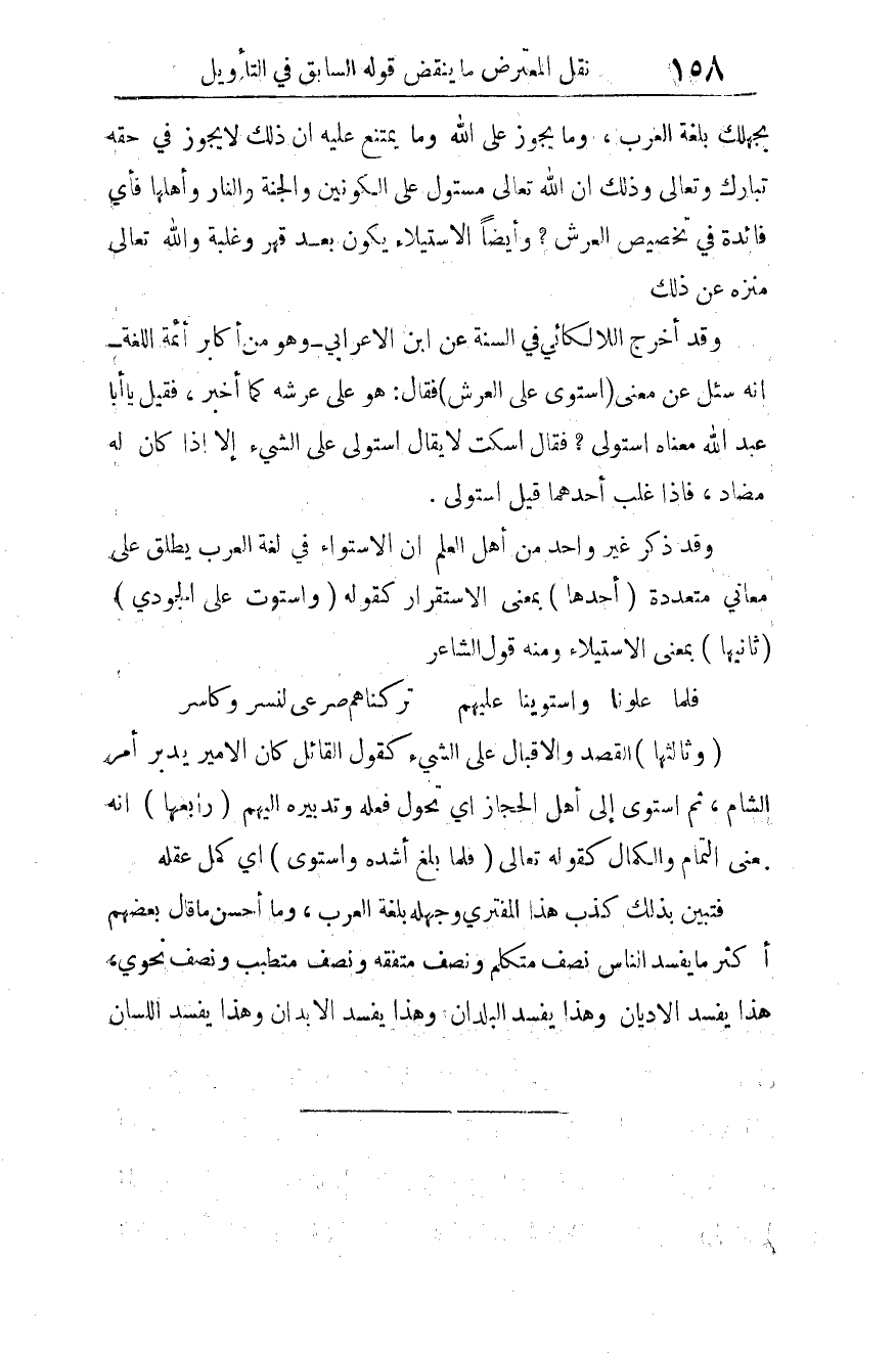 وقد أخرج اللالكائي في "السنة" عن ابن الأعرابي -وهو من أكابر أئمة اللغة- أنه سئل عن معنى: {اسْتَوَى عَلَى الْعَرْشِ} 1 فقال: هو على عرشه كما أخبر، فقيل: يا أبا عبد الله، معناه استولى؟ فقال: اسكت. لا يقال: استولى على الشيء إلا إذا كان له مضادٌّ، فإذا غلب أحدهما. قيل: استولى.
