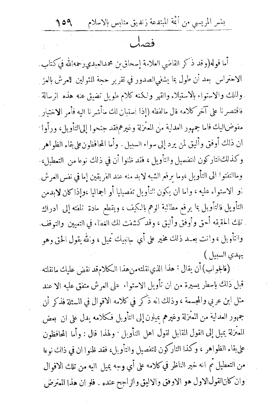 (فالجواب) أن يقال: هذا الذي نقلته من هذا الكلام، قد نقض عليك ما نقلته قبل ذلك بأسطر يسيرة من أن تأويل الاستواء على العرش متفق عليه، إلا عند مثل ابن عربي والمجسمة، وذلك أنه ذكر في كلامه الأقوال في المسألة.