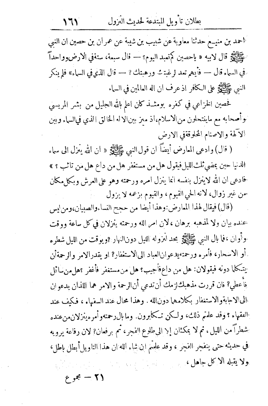 (قال): فيقال لهذا المعارض: وهذا أيضا من حجج النساء والصبيان، ومن ليس عنده بيان، ولا لمذهبه برهان؛ لأن أمر الله ورحمته ينزلان في كل ساعة ووقت وأوان، فما بال النبي صلى الله عليه وسلم يحد لنُزوله الليل دون النهار؟ ويوقت من الليل شطره أو الأسحار؟ فأمره ورحمته يدعوان العباد إلى الاستغفار؟ أَو يَقْدِرُ الأمر والرحمة أن يتكلما دونه فيقولان: هل من داع فأجيب؟ هل من مستغفر فأغفر؟ هل من سائل فأعطي؟ فإن قررت مذهبك لزمك أن تدعي أن الرحمة والأمر هما اللذان يدعوان إلى الإجابة والاستغفار بكلامهما دون الله. وهذا محال عند السفهاء، فكيف عند الفقهاء؟!
