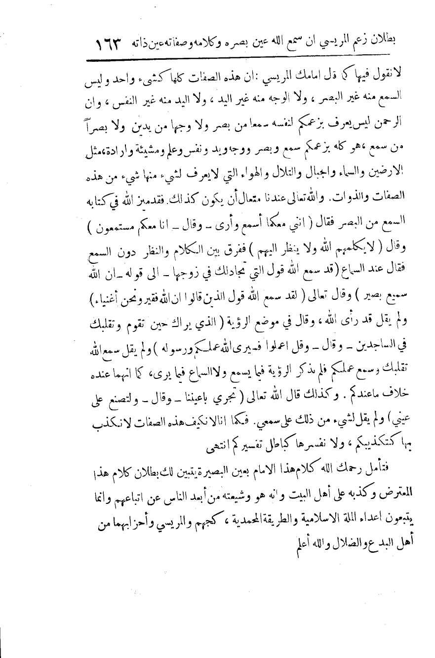 فتأمل -رحمك الله- كلام هذا الإمام بعين البصيرة يتبين لك بطلان كلام هذا المعترض، وكذبه على أهل البيت، وأنه هو وشيعته من أبعد الناس عن اتباعهم، وإنما يتبعون أعداء الملة الإسلامية والطريقة المحمدية، كجهم والمريسي وأحزابهما من أهل البدع والضلال، والله أعلم.