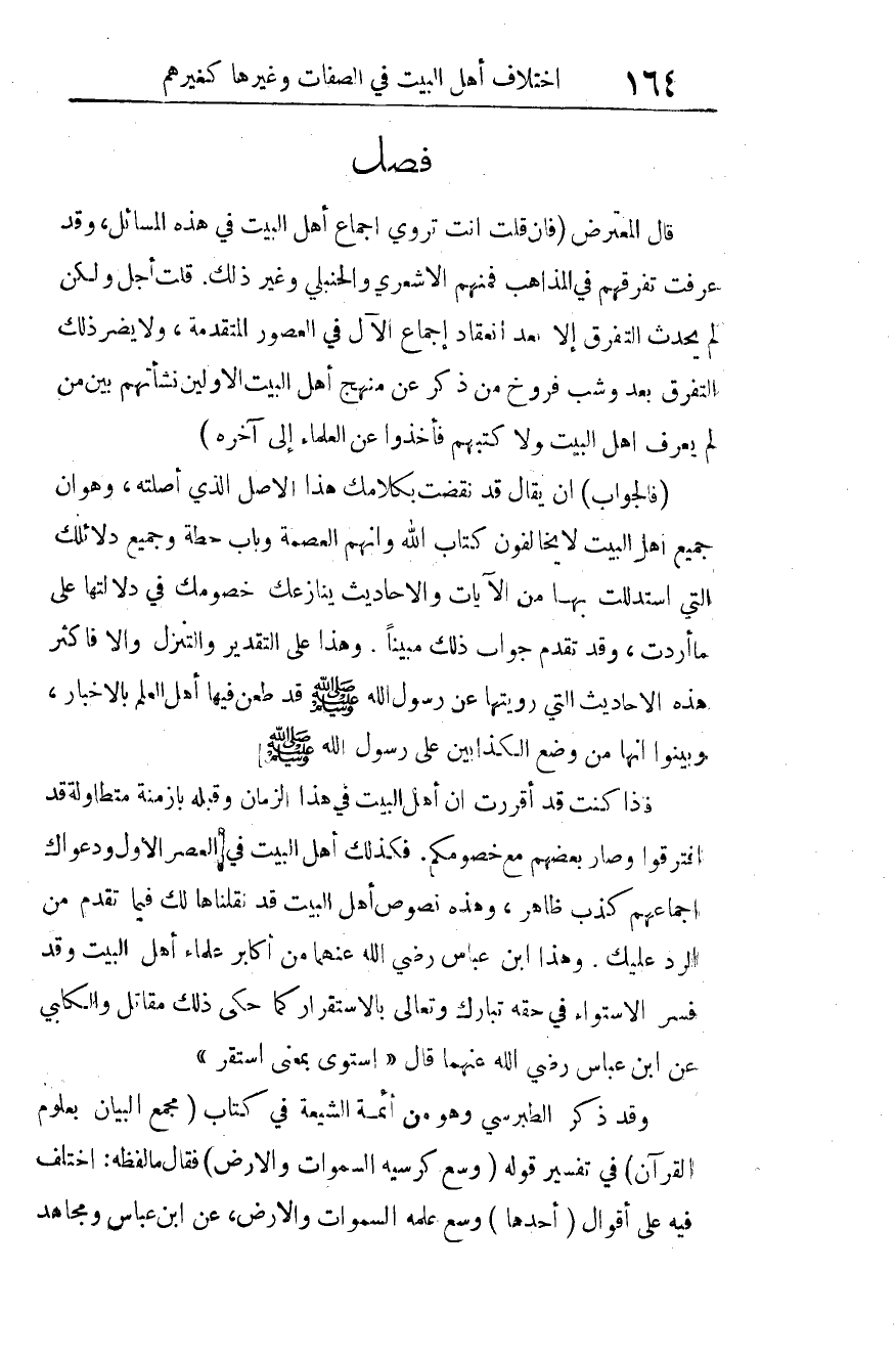 وهذه نصوص أهل البيت، قد نقلناها لك فيما تقدم من الرد عليك. وهذا ابن عباس -رضي الله عنهما- من أكابر علماء أهل البيت، وقد فسر الاستواء في حقه -تبارك وتعالى- بالاستقرار، كما حكى ذلك مقاتل والكلبي عن ابن عباس -رضي الله عنهما- قال: "استوى بمعنى استقر". وقد ذكر الطبرسي، وهو من أئمة الشيعة في كتاب "مجمع البيان بعلوم القرآن" في تفسير قوله: {وَسِعَ كُرْسِيُّهُ السَّمَاوَاتِ وَالأَرْضَ} 1 فقال ما لفظه: اختلف فيه على أقوال: