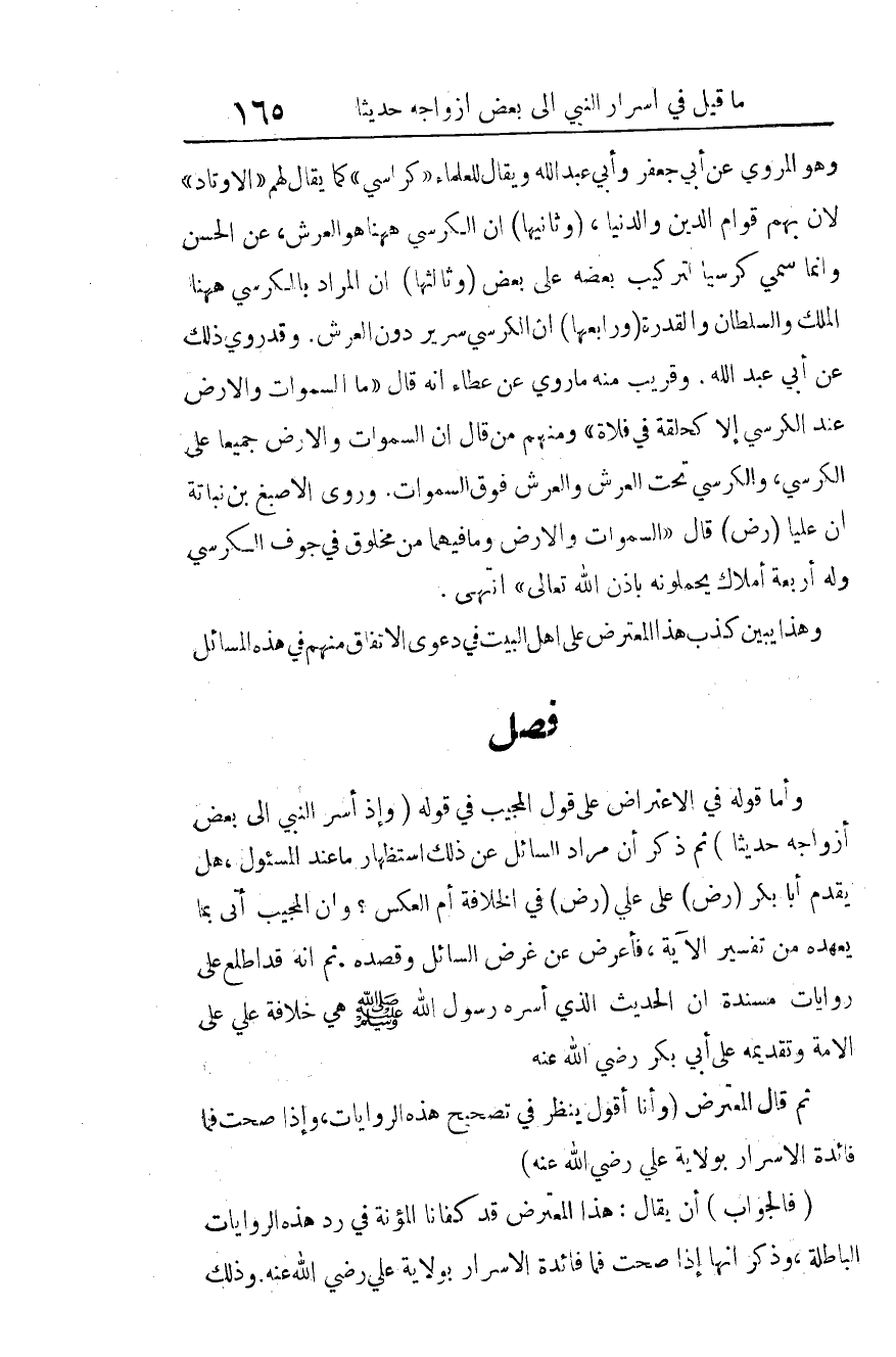 وأما قوله في الاعتراض على قول المجيب في قوله: {وَإِذْ أَسَرَّ النَّبِيُّ إِلَى بَعْضِ أَزْوَاجِهِ حَدِيثًا} 1، ثم ذكر أن مراد السائل من ذلك استظهار ما عند المسؤول، هل يقدم أبا بكر -رضي الله عنه- على علي -رضي الله عنه- في الخلافة أم العكس؟ وأن المجيب أتى بما يعهده من تفسير الآية، فأعرض عن غرض السائل وقصده.