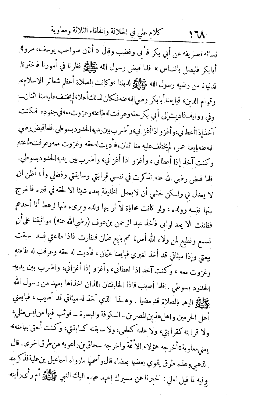 فلما أصيب فإذا الخليفتان اللذان أخذاها بعهد من رسول الله صلى الله عليه وسلم إليهما بالصلاة قد مضيا، وهذا الذي أخذ له ميثاقي قد أصيب، فبايعني أهل الحرمين وأهل هذين المصرين -الكوفة والبصرة- فوثب فيها من ليس مثلي، ولا قرابته كقرابتي، ولا علمه كعلمى، ولا سابقته كسابقتي، وكنت أحق بها منه، يعني: "معاوية". أخرجه هؤلاء الأئمة.