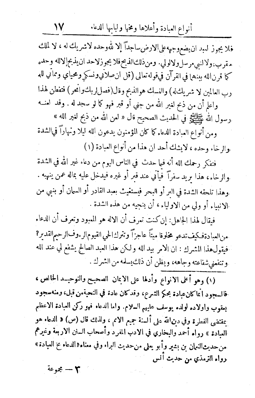 ومن أنواع العبادة: الدعاء: كما كان المؤمنون يدعون الله ليلا ونهارا في الشدة والرخاء وحده، لا يشك أحد أن هذا من أنواع العبادة 4.