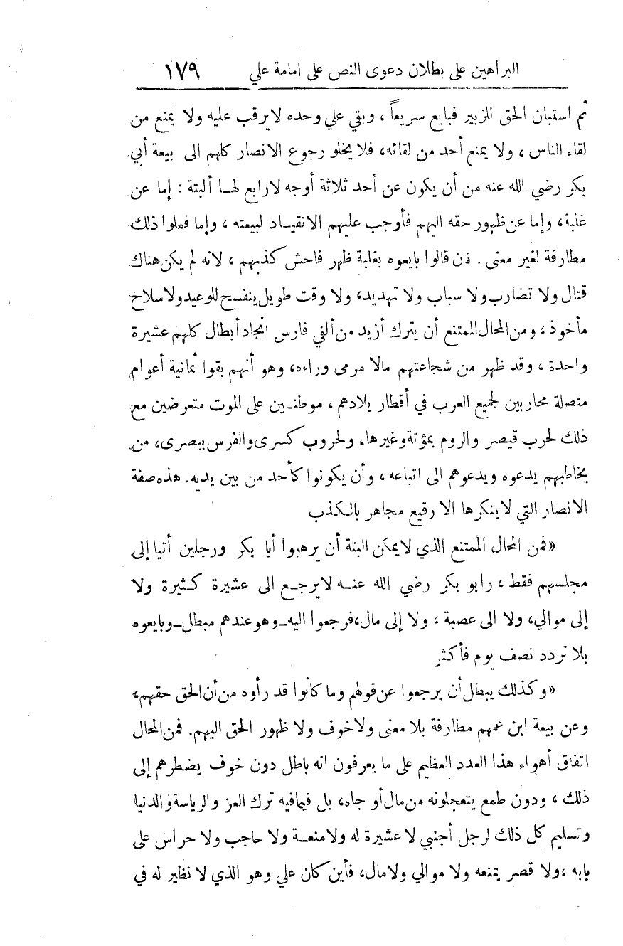 فلا يخلو رجوع الأنصار كلهم إلى بيعة أبي بكر رضي الله عنه من أن يكون عن أحد ثلاثة أوجه، لا رابع لها البتة: إما عن غلبة، وإما عن ظهور حقه إليهم فأوجب عليهم الانقياد لبيعته، وإما فعلوا ذلك مطارفة لغير معنى. فإن قالوا: بايعوه بغلبة، ظهر فاحش كذبهم؛ لأنه لم يكن هناك قتال ولا تضارب، ولا سباب ولا تهديد، ولا وقت طويل ينفسح للوعيد، ولا سلاح مأخوذ، ومن المحال الممتنع أن يترك أزيد من ألفي فارس أنجاد أبطال، كلهم عشيرة واحدة، وقد ظهر من شجاعتهم ما لا مرمى وراءه، وهو أنهم بقوا ثمانية أعوام متصلة محاربين لجميع العرب في أقطار بلادهم، مُوَطَّنِين على الموت، متعرضين مع ذلك لحرب قيصر والروم بمؤتة وغيرها، ولحروب كسرى والفرس ببصرى، من يخاطبهم يدعوه ويدعوهم إلى اتباعه، وأن يكونوا كأحد من بين يديه. هذه صفة الأنصار التي لا ينكرها إلا رقيع مجاهر بالكذب.