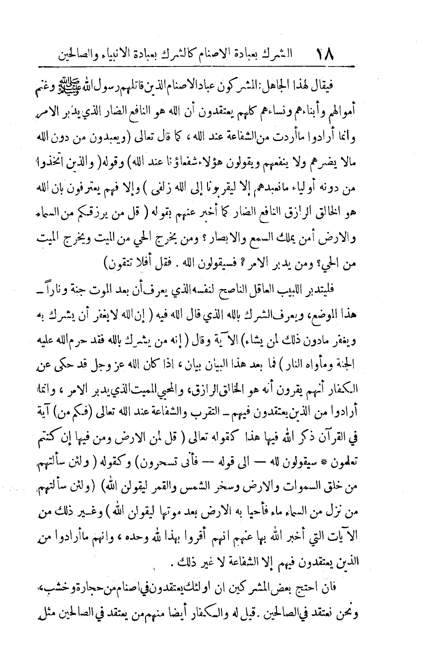 فليتدبر اللبيب العاقل الناصح لنفسه الذي يعرف أن بعد الموت جنة ونارا، هذا الموضع، ويعرف الشرك بالله الذي قال الله فيه: {إِنَّ اللَّهَ لا يَغْفِرُ أَنْ يُشْرَكَ بِهِ وَيَغْفِرُ مَا دُونَ ذَلِكَ لِمَنْ يَشَاءُ} 4 الآية. وقال: {إِنَّهُ مَنْ يُشْرِكْ بِاللَّهِ فَقَدْ حَرَّمَ اللَّهُ عَلَيْهِ الْجَنَّةَ وَمَأْوَاهُ النَّارُ} 5. فما بعد هذا البيان بيان! إذا كان الله عز وجل قد حكى عن الكفار أنهم يقرون أنه هو الخالق الرازق، والمحيي المميت الذي يدبر الأمر، وإنما أرادوا من الذين يعتقدون فيهم التقرب والشفاعة عند الله -تعالى-.