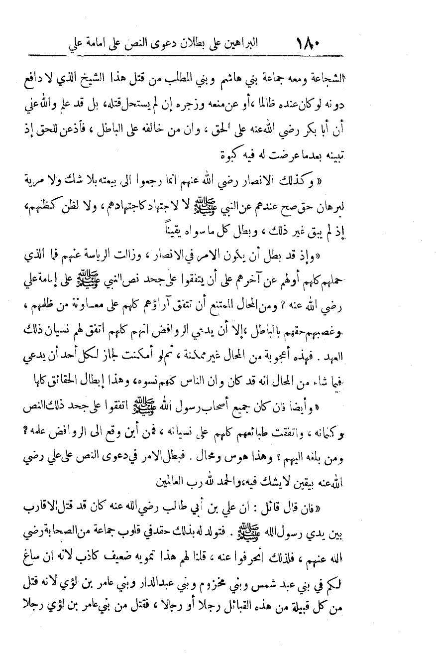 "وإذ قد بطل أن يكون الأمر في الأنصار، وزالت الرياسة عنهم. فما الذي حملهم كلهم أولهم عن آخرهم على أن يتفقوا على جحد نص النبي صلى الله عليه وسلم على إمامة علي رضي الله عنه؟